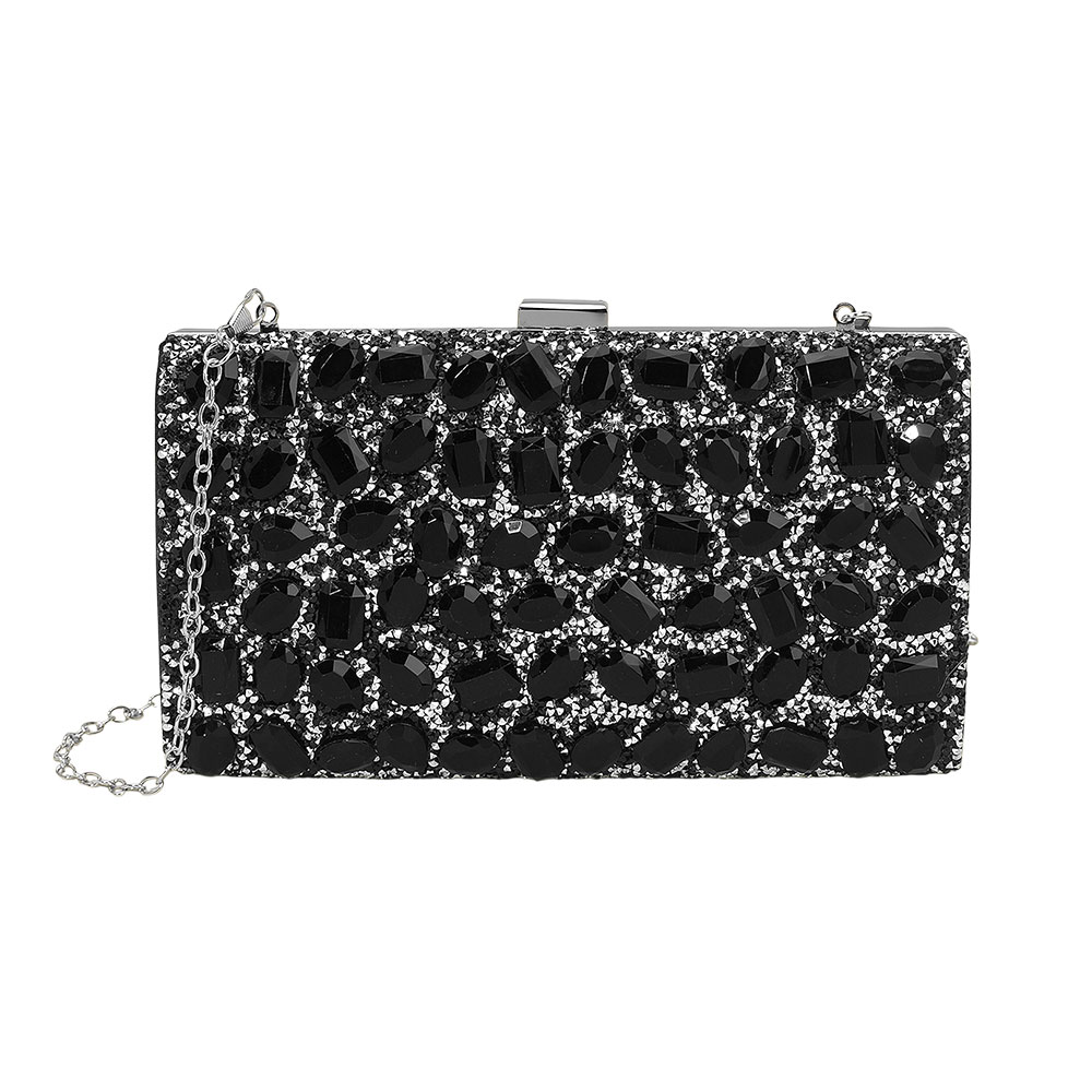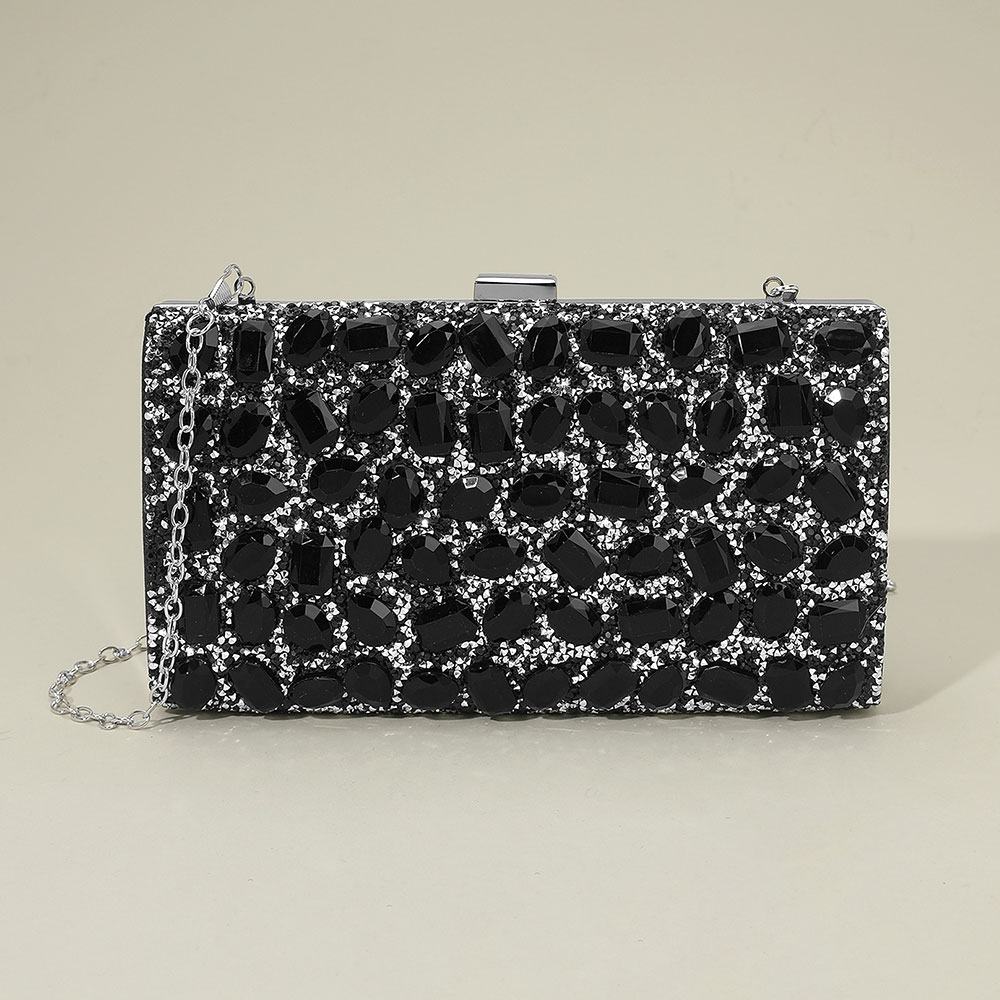 Details • Size : 8.6" X 4.6" X 1.6" • Strap Size : 47" L / Detachable • Clasp Closure • Glamorous evening clutch adorned with sparkling stone accents for a statement look. Designed with a sleek silhouette and chain strap, this stylish accessory adds a touch of elegance to special occasions, parties, and night-out outfits.