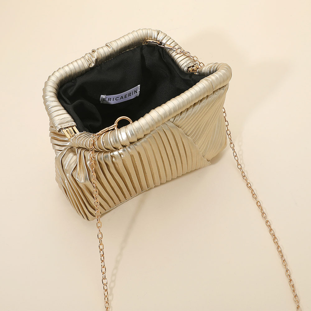 Details • Size : 9" X 6" X 2.5" • Strap Size : 46" L / Detachable • One Inside Slip Pocket • Clasp Closure • This refined evening clutch showcases a sculpted, pleated exterior with a soft, structured silhouette that adds dimension and elegance. A detachable chain strap offers styling versatility, making it an ideal accessory for special events, nights out, or polished everyday looks.