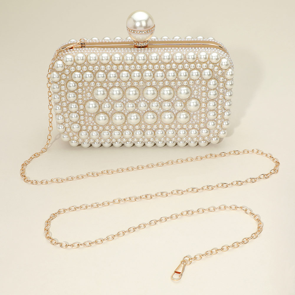 Details • Size : 8" X 4.5" X 2.25" • Pearl Clasp Size : 1.4" L • Strap Size : 46" L / Detachable • Clasp Closure • Elegant evening clutch adorned with layered faux pearl detailing and a statement dome clasp. Perfect for weddings, parties, and formal occasions. Structured box shape with luxe finish.