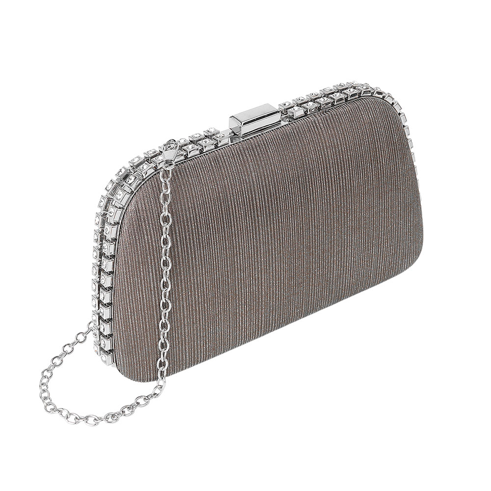 • Chic evening clutch featuring a textured finish, shimmering rhinestone trim, and a detachable chain strap. Designed with a sleek clasp closure and gold-tone accents, this sophisticated handbag is perfect for weddings, parties, and formal events, adding timeless glamour to any outfit.