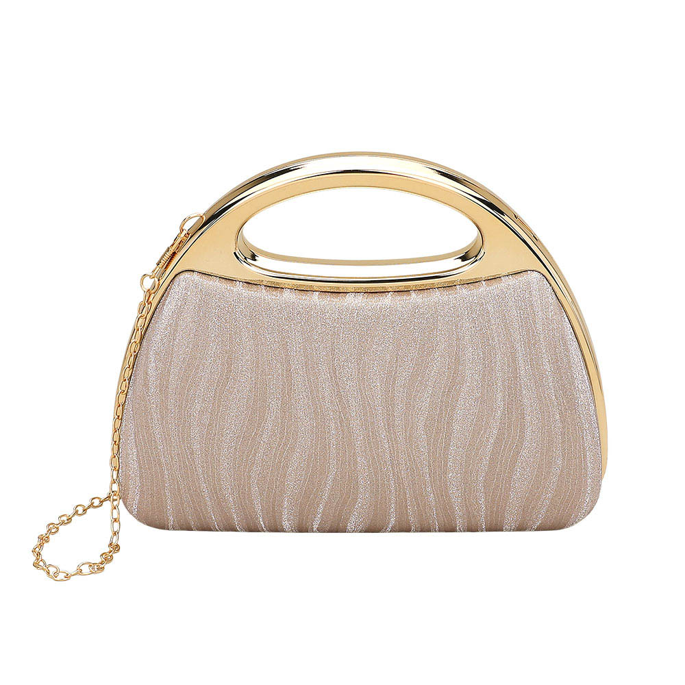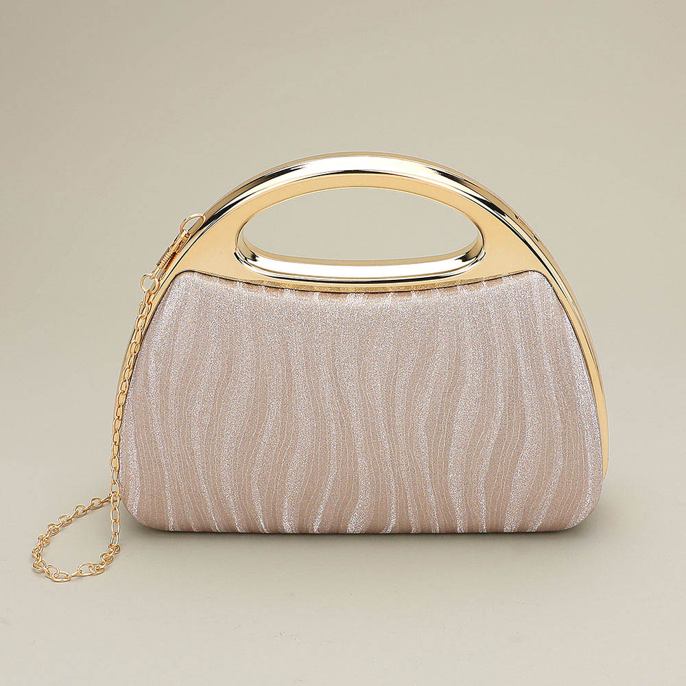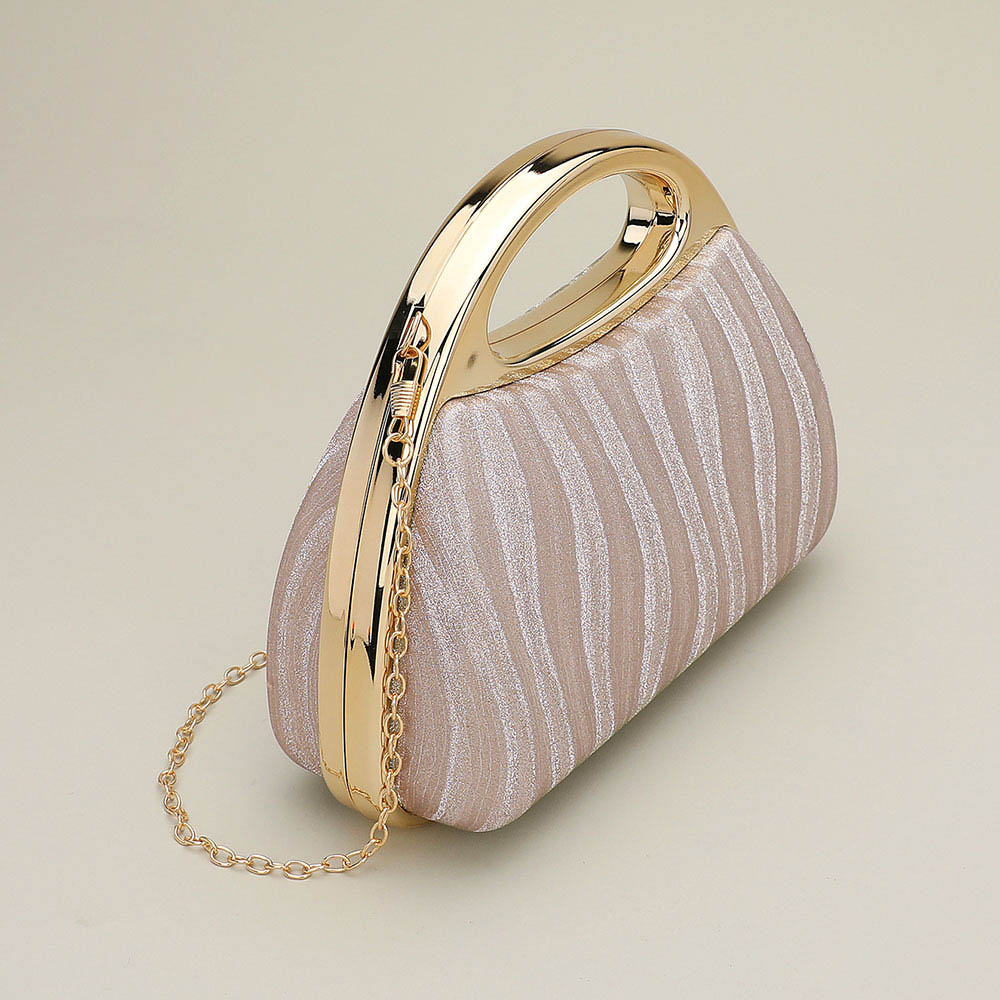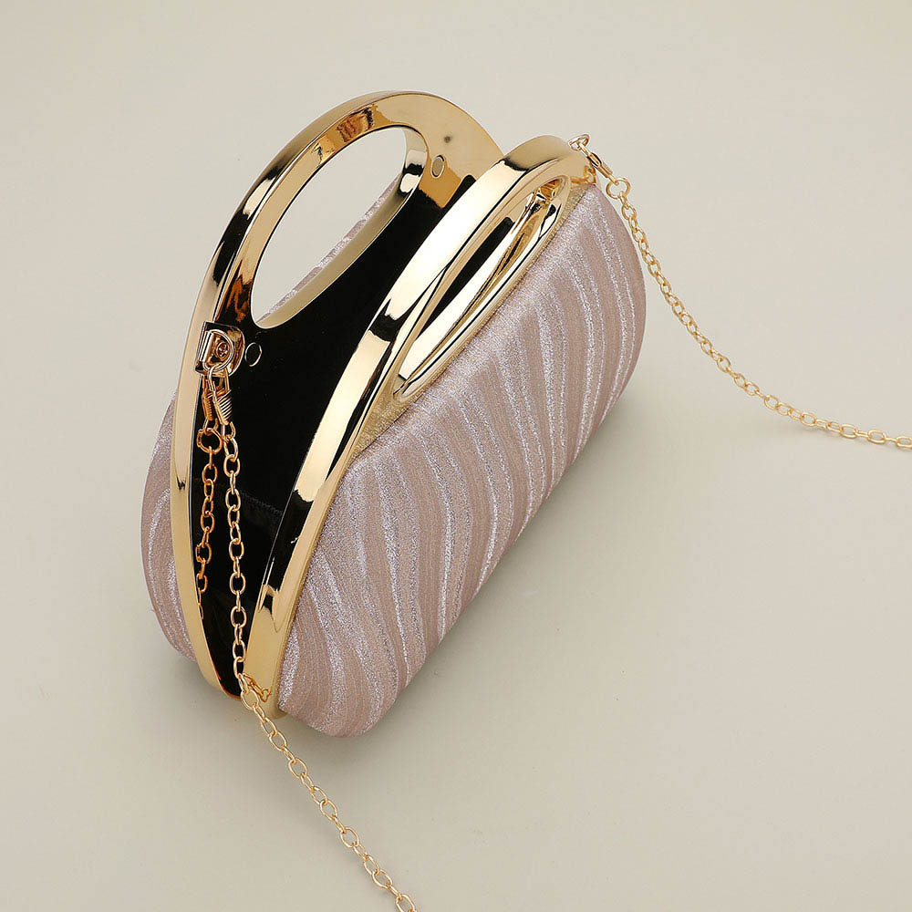 • A refined evening handbag featuring a sculpted silhouette, metallic handle, and shimmering textured body. Designed for formal events, it offers a polished finish and a detachable chain for versatile styling, keeping essentials organized while enhancing any sophisticated look.