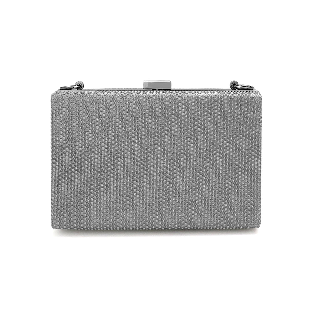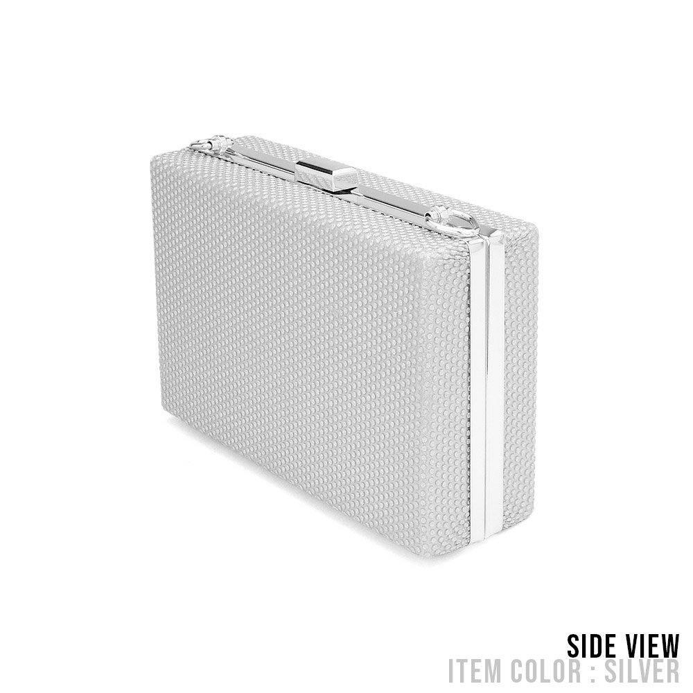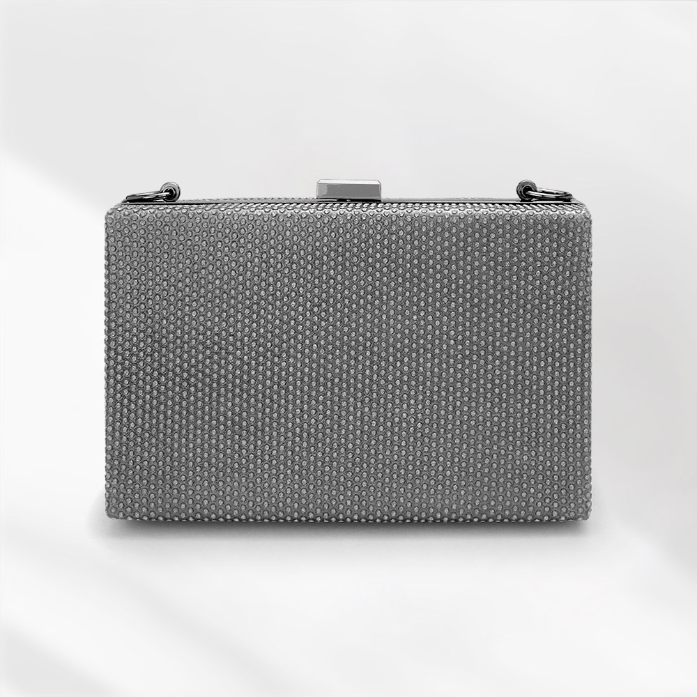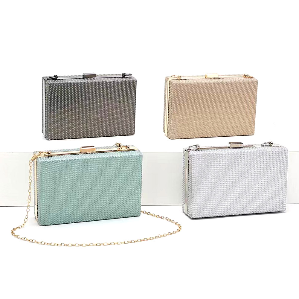 • Chic rectangular evening clutch with shimmering texture and detachable chain strap, perfect for weddings, parties, and special events. Features a sleek clasp closure and compact interior for essentials, combining sophistication and sparkle for timeless formal style.