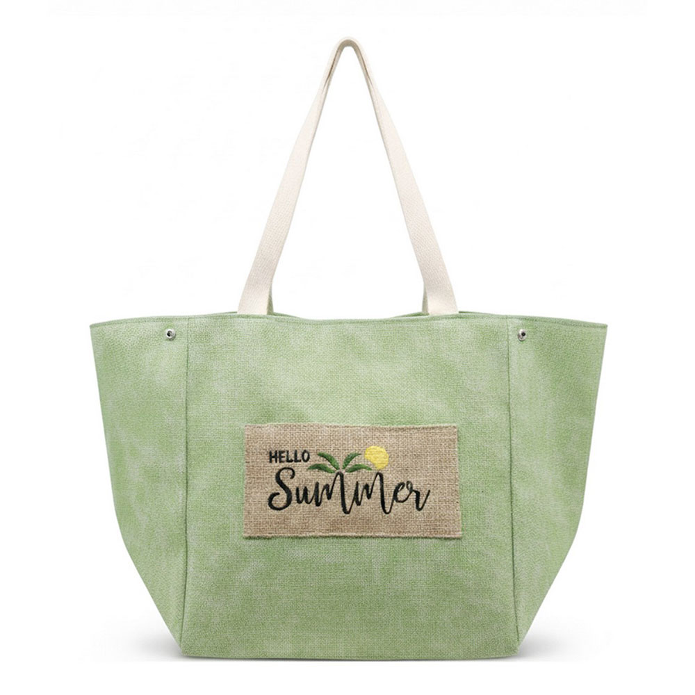 Details • Size : 22" X 13" X 9.5" • Inner Pocket • Magnetic Snap Closure • Material : 90% Polyester, 10% Burlap • Spacious everyday tote bag designed with a message patch for casual outings, travel, beach trips, and seasonal retail displays. Features a roomy interior and comfortable shoulder straps, making it ideal for carrying daily essentials, vacation must-haves, and warm-weather lifestyle accessories.