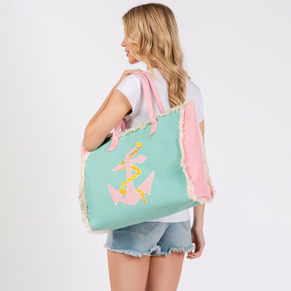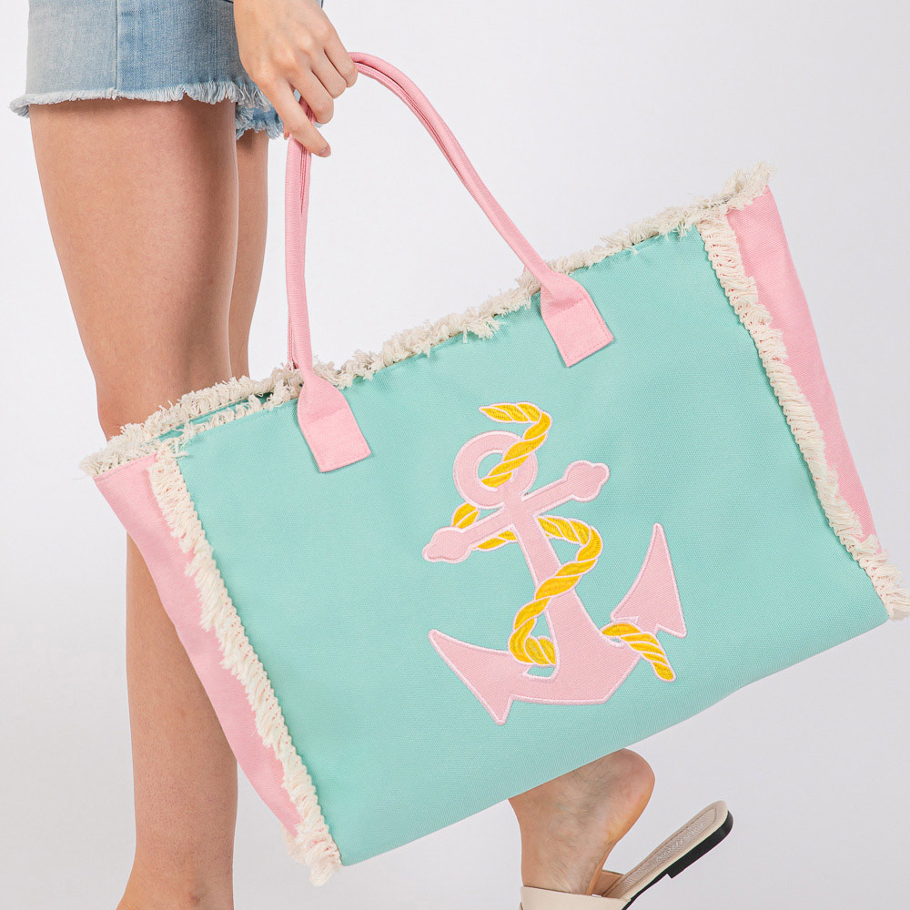 Details • Size : 17.5" X 14" X 5" • One Inside Pocket • Magnetic Closure • Material : 100% Polyester • Stylish beach tote featuring a bold anchor graphic, roomy interior for all essentials, and dual shoulder straps. Finished with fringe accents, perfect for seaside adventures, picnics, or everyday carry.