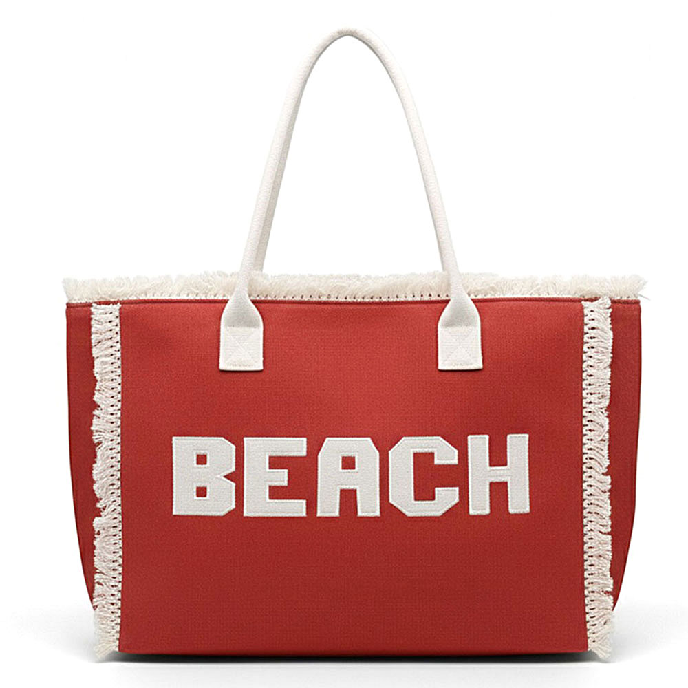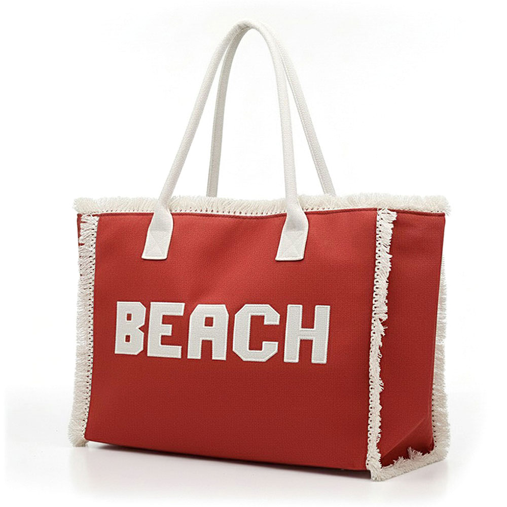 Details • Size : 17.5" X 14" X 5" • Inner Pocket • Zipper Closure • Material : 100% Polyester • Statement oversized tote bag with bold BEACH lettering, perfect for travel, vacations, pool days, and everyday carry. Open interior fits towels, clothing, and essentials with ease. Comfortable shoulder straps make it ideal for resorts, boutiques, and seasonal displays.