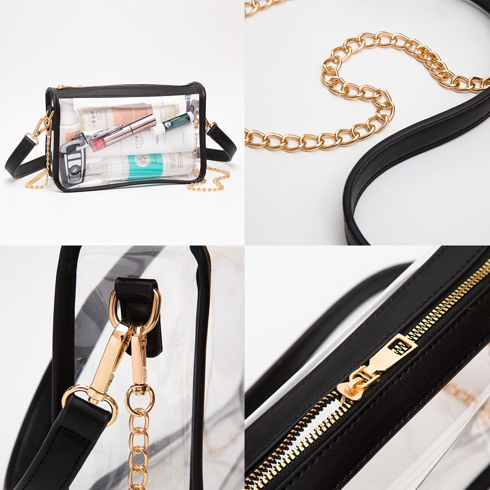 • Stay effortlessly chic with this clear crossbody bag featuring a sleek transparent body and stylish chain strap. Perfect for concerts, events, or daily outings, it combines modern design with practical elegance for a versatile accessory that complements any outfit.