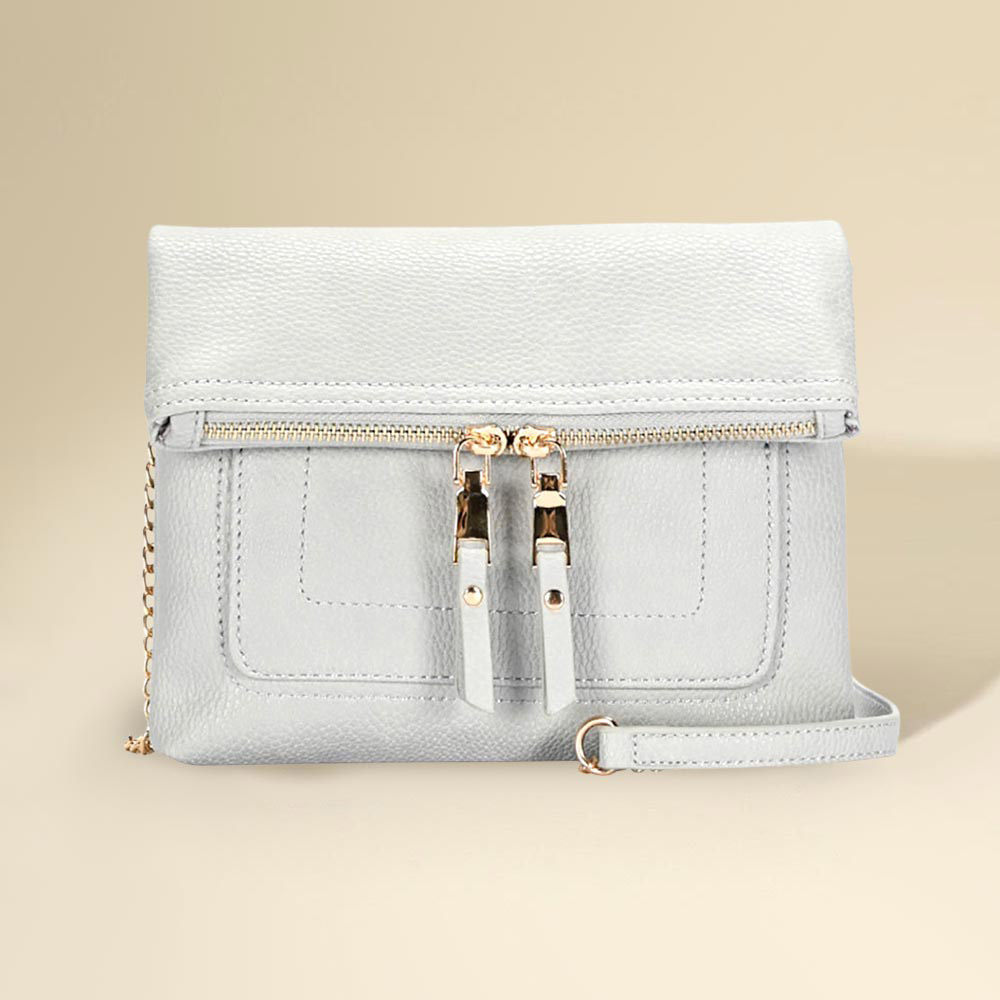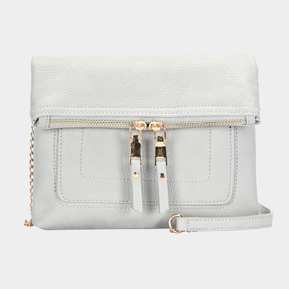• Elevate your look with this crossbody clutch featuring a sleek fold-over flap and dual zipper accents. Designed with a slim chain strap, this compact handbag offers the perfect mix of elegance and practicality for day-to-night wear.