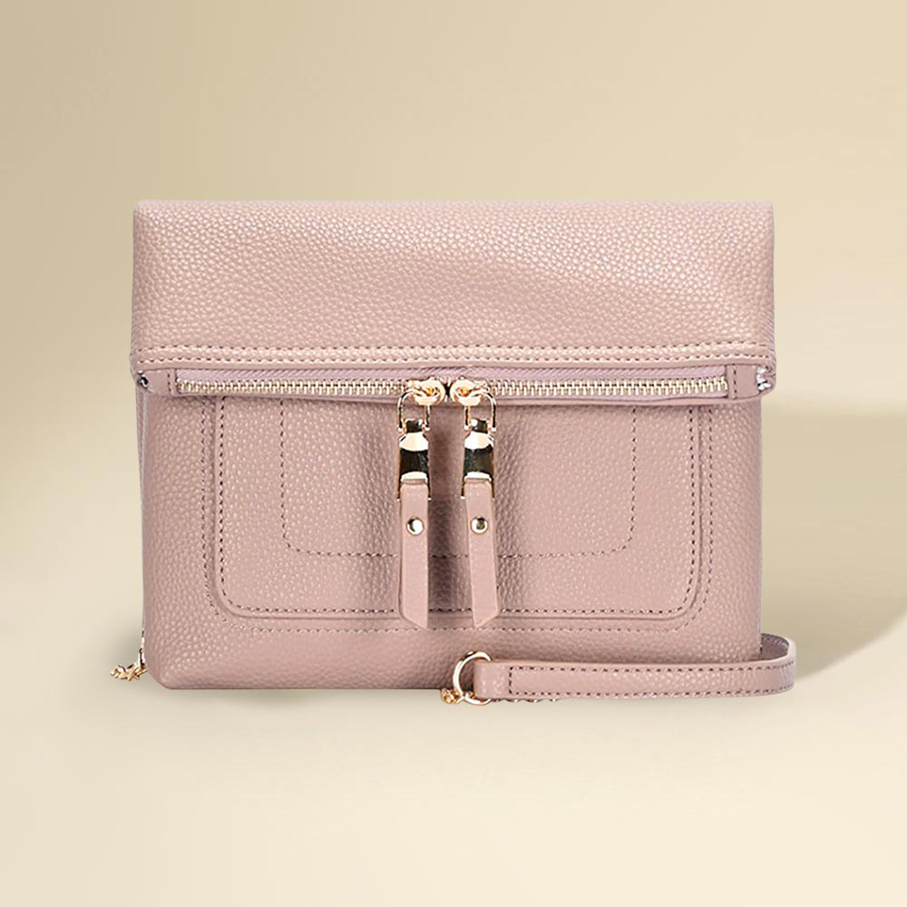 • Elevate your look with this crossbody clutch featuring a sleek fold-over flap and dual zipper accents. Designed with a slim chain strap, this compact handbag offers the perfect mix of elegance and practicality for day-to-night wear.
