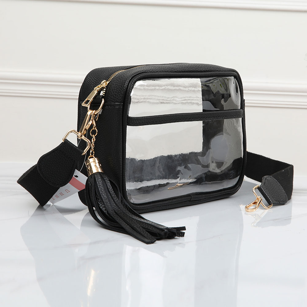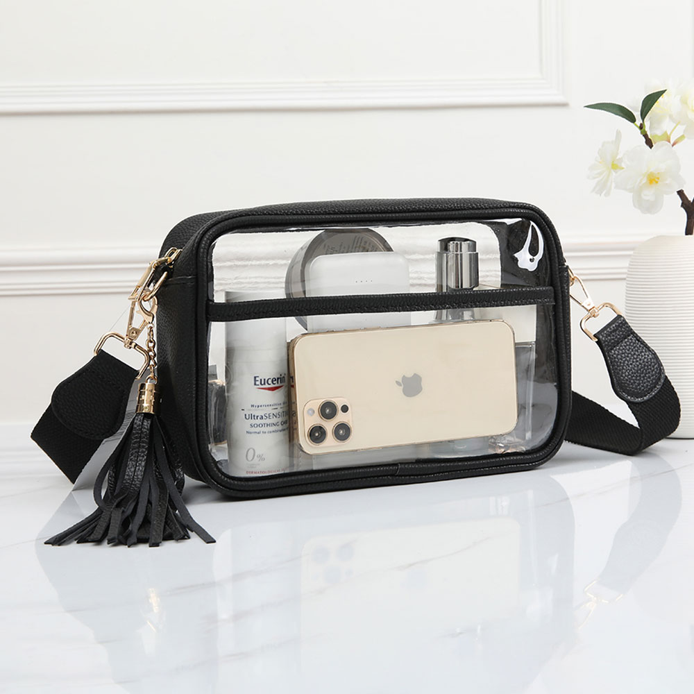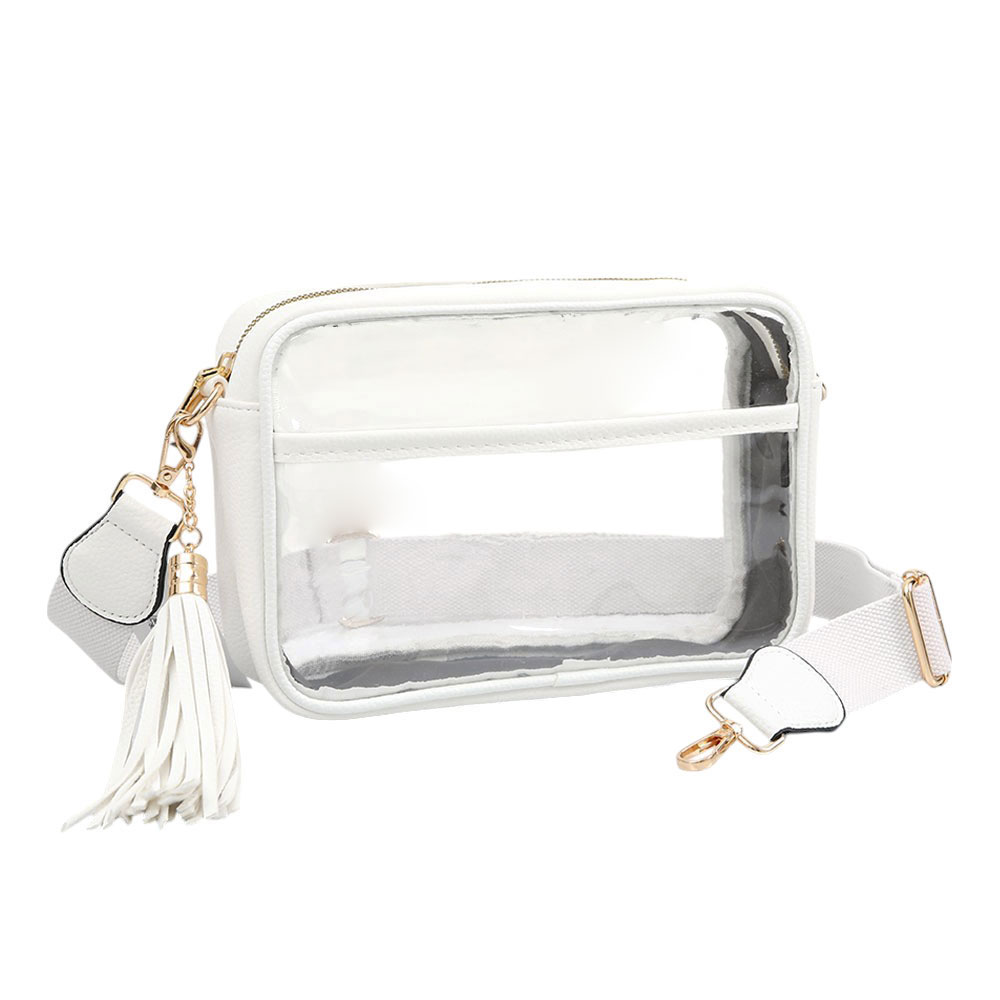 Details • Size : 9.5" X 6" X 2.5" • Strap Size : 51" L / Detachable, Adjustable • One Outside Slip Pocket • Zipper Closure • Stay stylish and compliant with this clear stadium-approved crossbody bag. Perfect for concerts, sports events, and travel. Features an adjustable strap, zip closure, and compact size to keep essentials secure and visible.