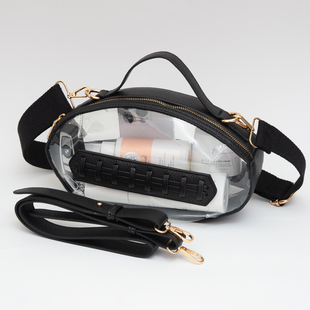 • Oval clear crossbody bag with wide adjustable strap, zip closure, and bold front accent detail. Lightweight and stadium-approved, this stylish accessory blends fashion and function for everyday or event use.