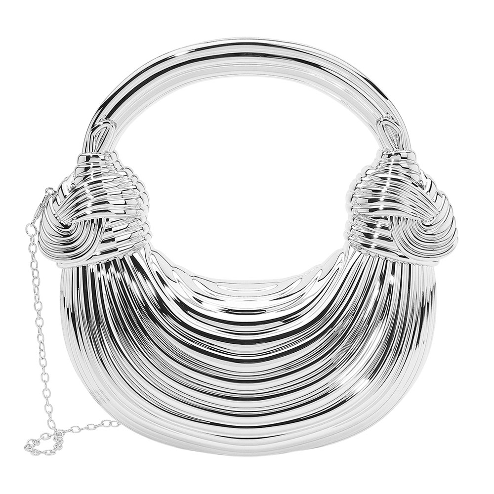 Details • Size : 10" X 10" X 3.25" • Top Handle Size : 5" L • Strap Size : 46" L / Detachable • Magnetic Closure • This sculpted fashion bag features a distinctive loop-handle silhouette with layered, curved ridges that create a bold, fluid shape. A sleek chained detail adds versatility, making it an expressive accessory that elevates evening outfits and modern, statement-driven looks.
