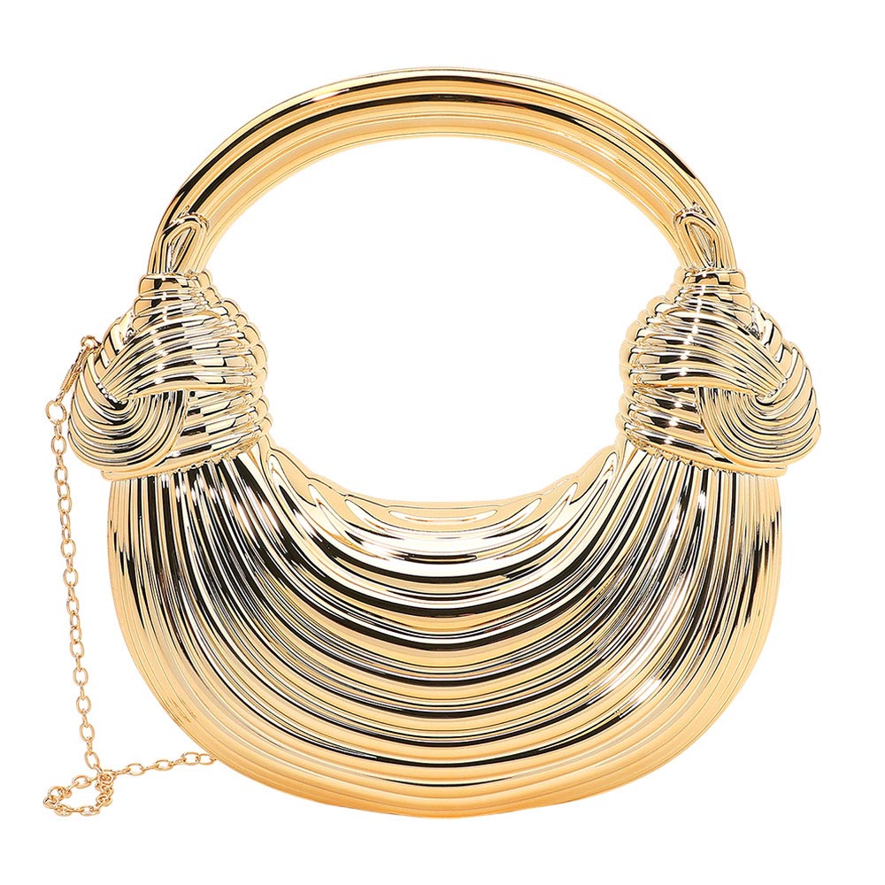 • This sculpted fashion bag features a distinctive loop-handle silhouette with layered, curved ridges that create a bold, fluid shape. A sleek chained detail adds versatility, making it an expressive accessory that elevates evening outfits and modern, statement-driven looks.