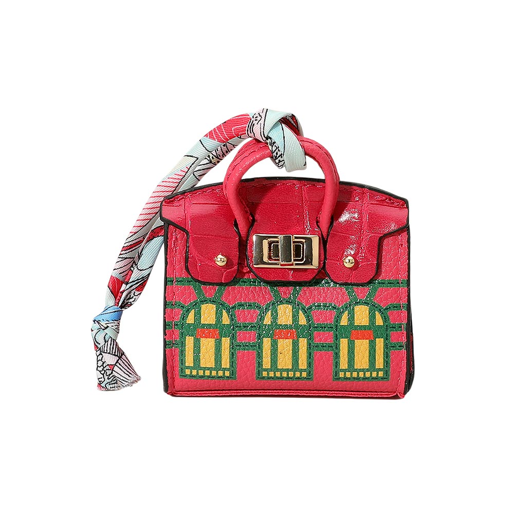 Details • Size : 3" X 2.75" X 1.5", 1" L • Strap Size : 7" L / Detachable • Miniature handbag-style lock closure • Decorative metal rivets and clasp hardware detail • fits Earphone, Earbuds, Small Accessory • Can be used as a keychain, bag charm, or collectible accessory • Add a fun touch to your look with this mini printed handbag keychain. Featuring a detailed window pattern and scarf accent, it's a stylish charm for bags or keys with a playful twist and functional clasp.