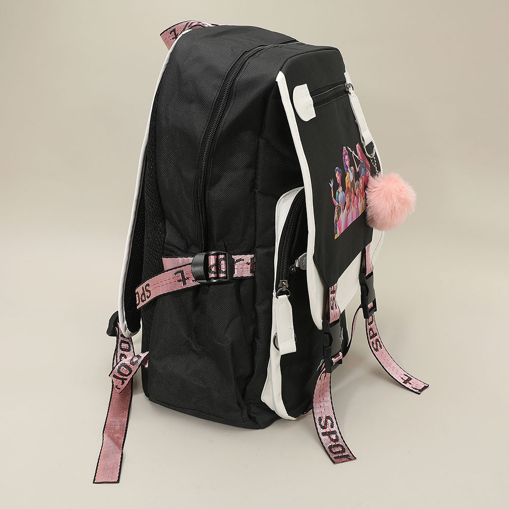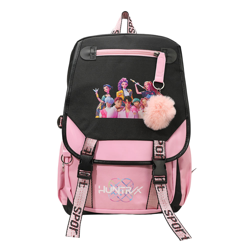 Details • Size : 10.5" X 15.5" X 4.75" • Pom Pom Size : 2.75" X 3" • USB Size : 19.5" • Strap Size : Adjustable • 5 Inside Slip Pockets / Pen Holders • 3 Outside Zipper Pockets • Zipper Closure • Stylish K-Pop Demon Hunters backpack designed for fans who want bold character graphics with everyday practicality. Features spacious compartments, secure closures, and functional details ideal for school, travel, or daily use. A must-have pop culture backpack that stands out in retail displays and gift collections.