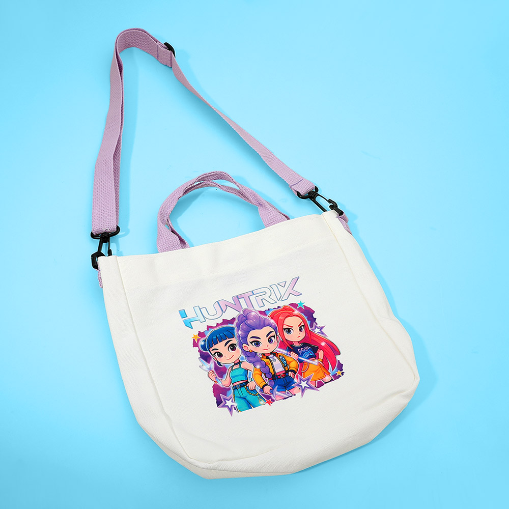 Details • Size : 9.5" X 9" X 2.25" • Top Handle Size : 3.5" L • Strap Size : 41" L / Detachable, Adjustable • Magnetic Closure • Material : 100% Polyester • Stylish tote bag featuring bold HUNTR/X character artwork with a practical carry design ideal for daily errands, shopping, events, conventions, or casual outings. Lightweight and spacious enough for essentials, making it a versatile accessory for fans and everyday use.