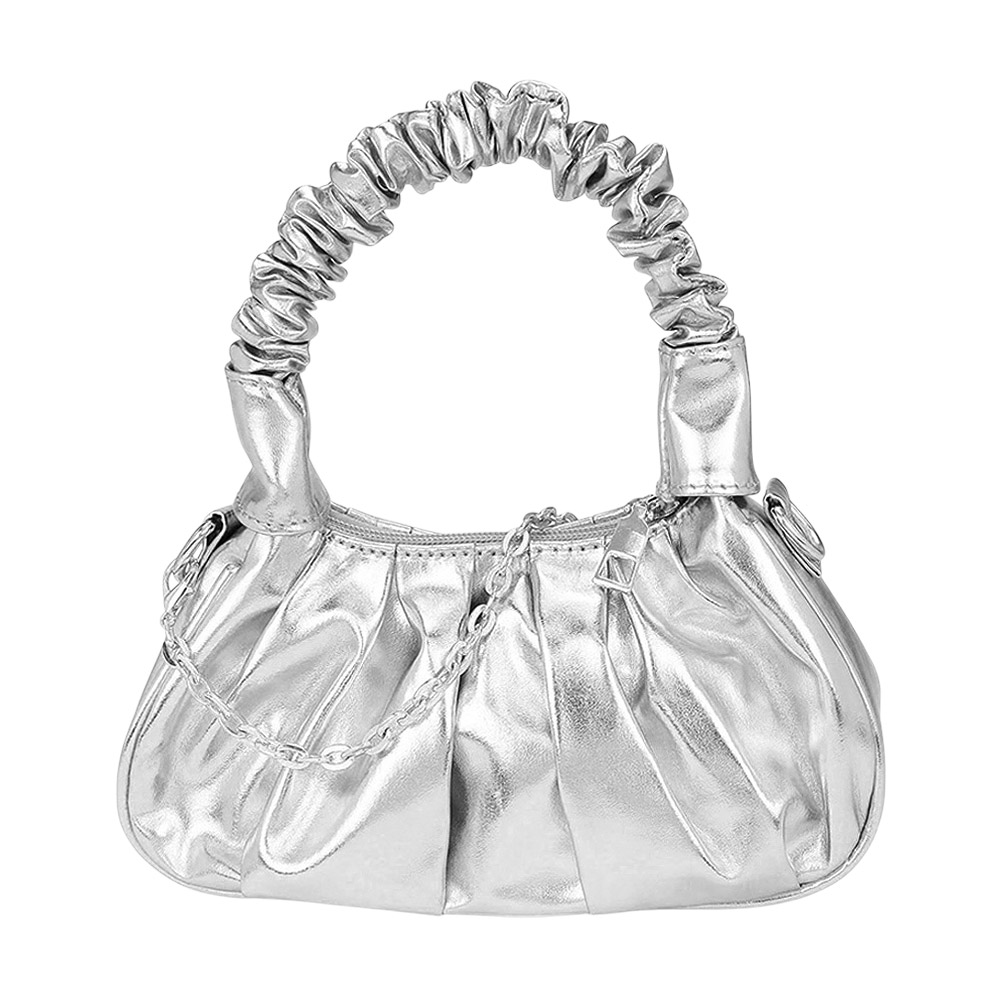 Details • Size : 8.25" X 4.75" X 2.75" • Top Handle Size : 3.25" L • Strap Size : 50" L / Detachable • Zipper Closure • Elevate any outfit with this chic ruched handbag featuring a gathered handle and chain detail. Its modern silhouette and versatile design make it perfect for day-to-night wear, adding effortless style and sophistication to your look.
