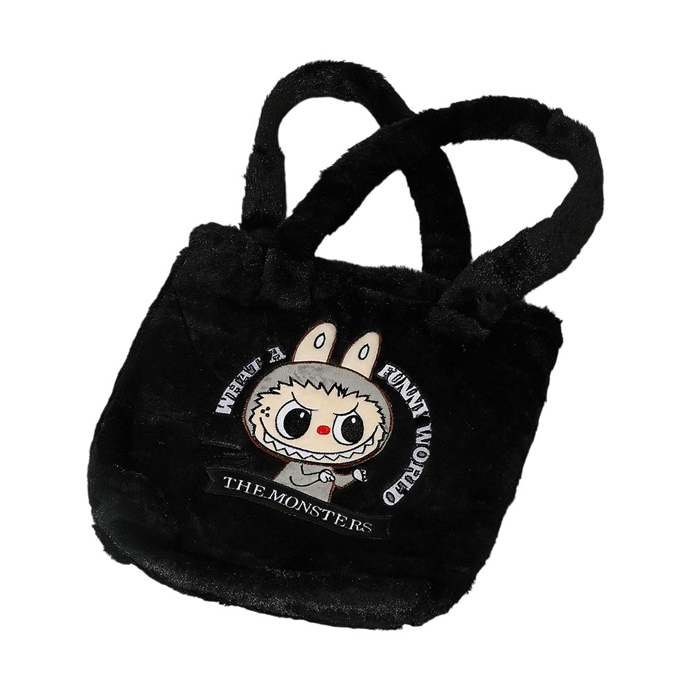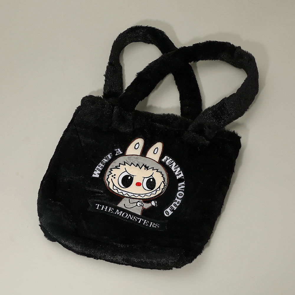 Monster Bunny Character Embroidered Faux Fur Plush Tote Bag