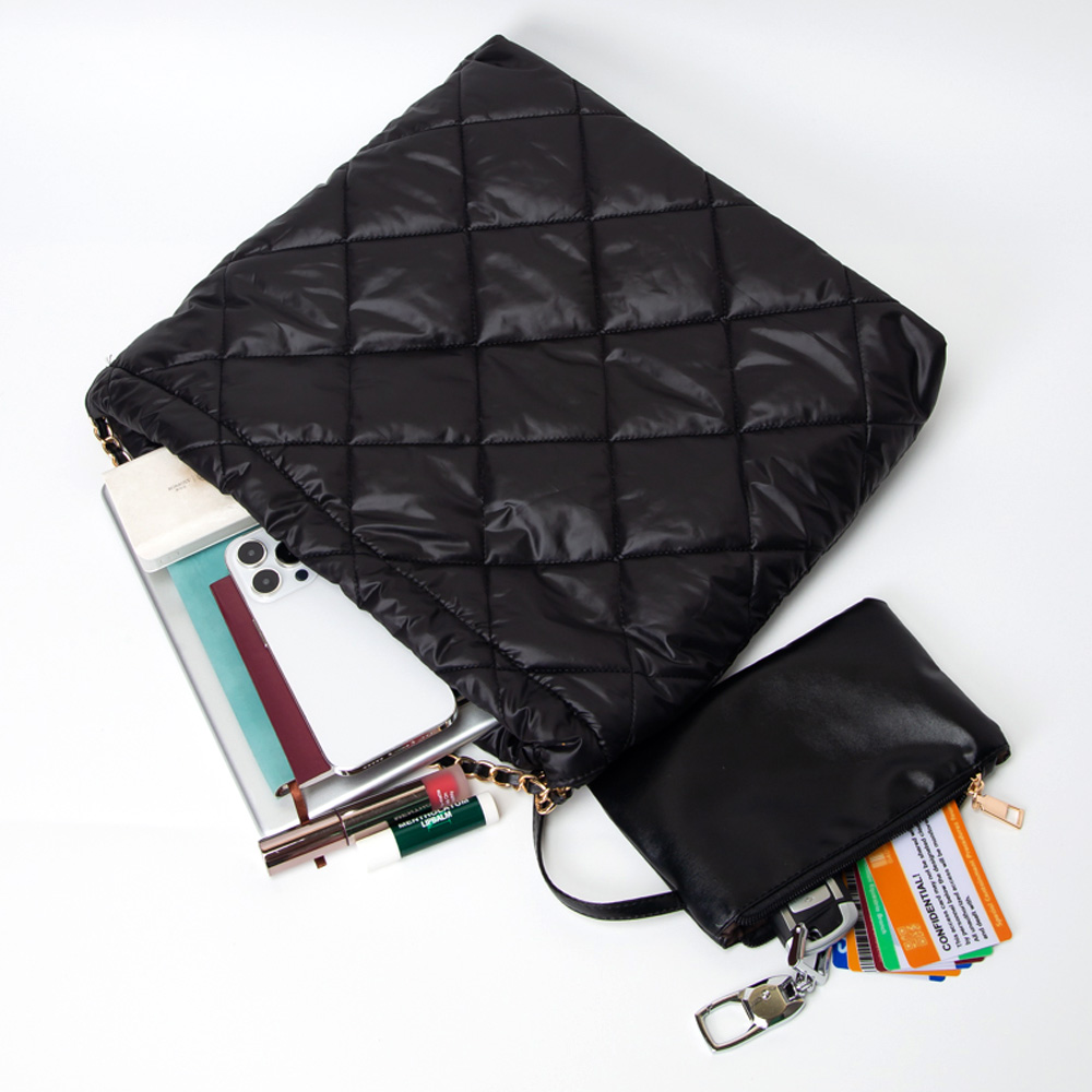 Details • Size : 13.4" X 13" X 3.5" • Strap : Adjustable • One Inside Zipper Pocket • One Inside Slip • Pocket • One Inside Pouch Bag (7.75" X 4.75", Zipper Closure) / Attachable • Elevate everyday style with this quilted oversized shoulder bag featuring a chic chain handle and a soft, slouchy silhouette. Spacious and versatile, it’s ideal for daily use, offering a fashionable blend of practicality and modern design for work, travel, or casual outings.