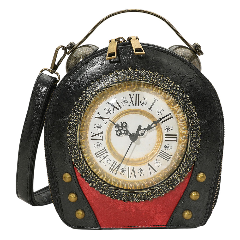 Details • Size : 8" X 7.75" X 4" • Top Handle Size : 1.5" L • Strap Size : 52: L / Adjustable, Detachable • One Inside Slip Pocket • One Inside Zipper Pocket • Zipper Closure • Unique crossbody bag with a vintage-inspired clock face design, antique gold-tone details, and bold accents. A statement accessory perfect for themed outfits, cosplay, or everyday standout style.