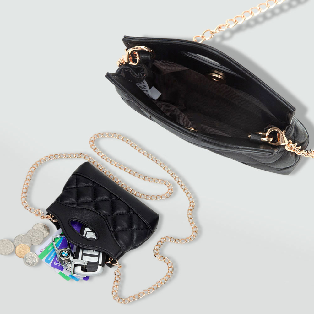 Details • Size : 5.5" X 4" X 1.25" • Top Handle Size : 0.8" L • Strap Size : 42" L / Detachable • Magnetic Closure • Stay stylish and organized with this mini quilted crossbody bag featuring a sleek chain strap and unique cutout handle. Perfect for carrying essentials like cards, keys, and small items, it offers trendy convenience for outings, travel, and everyday use while adding a chic touch to any look.