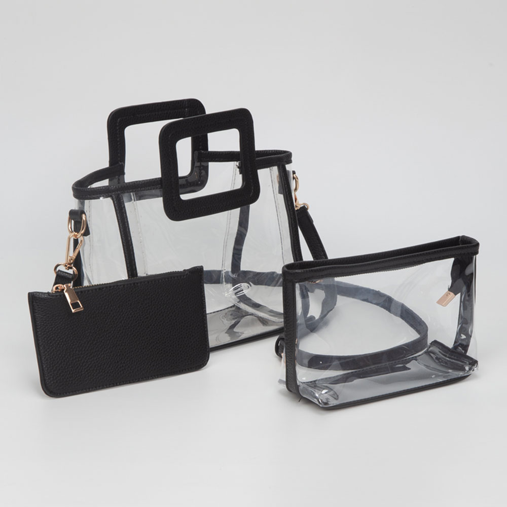 • Stylish clear 3-piece bag set featuring a structured top-handle tote, detachable crossbody insert and matching zip pouch. Ideal for stadium events and everyday organization, offering convenient storage, lightweight design and versatile carrying options for on-the-go use.