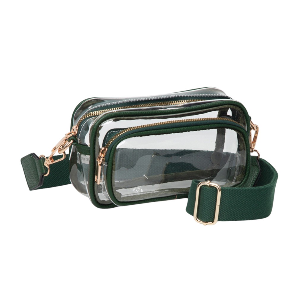 • Be game day ready with this clear stadium-approved crossbody bag, featuring white trim, dual zip compartments, and an adjustable strap for hands-free comfort. Perfect for concerts, sporting events, festivals, and venues with clear bag policies, offering style, security, and convenience on the go.