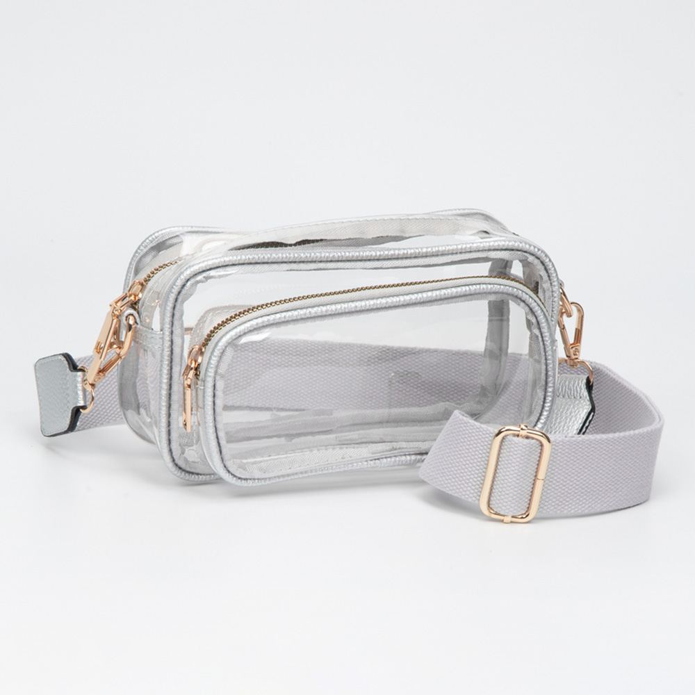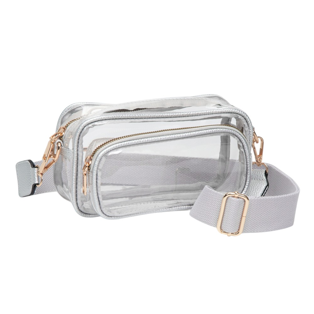 Details • Size : 8" X 5" X 3.5" • Strap Size : 53" L / Detachable, Adjustable • One Outside Zipper Pocket • Zipper Closure • Be game day ready with this clear stadium-approved crossbody bag, featuring white trim, dual zip compartments, and an adjustable strap for hands-free comfort. Perfect for concerts, sporting events, festivals, and venues with clear bag policies, offering style, security, and convenience on the go.