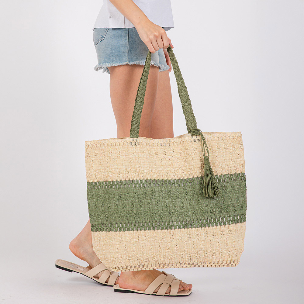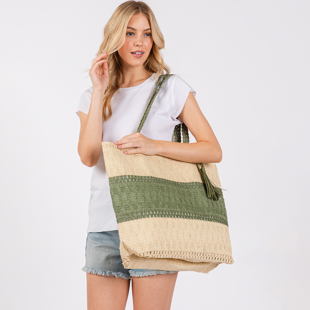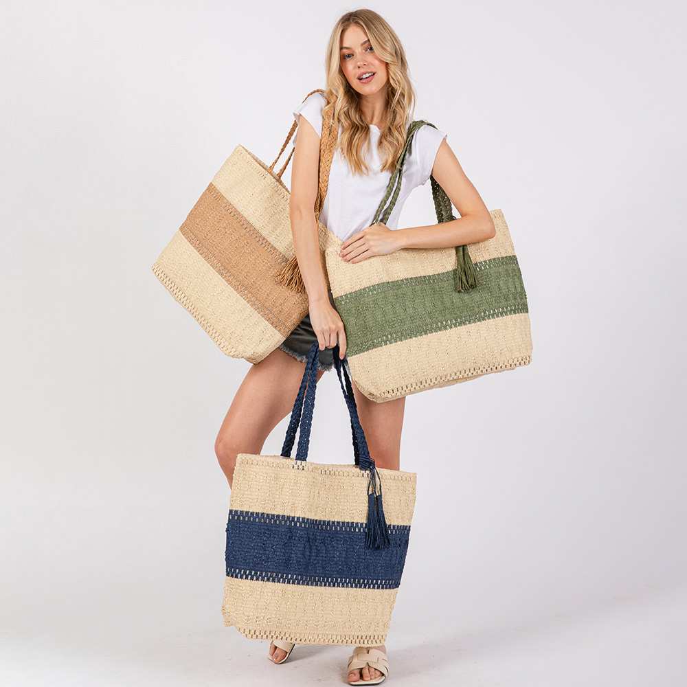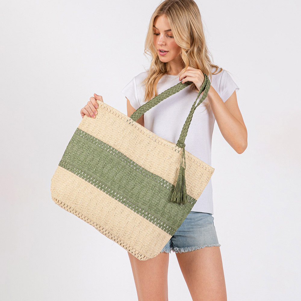 Two Tone Color Block Woven Tassel Straw Tote Bag / Beach Bag