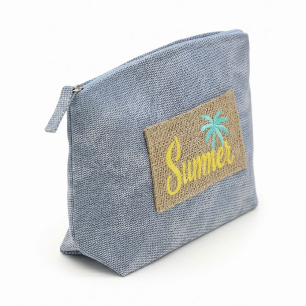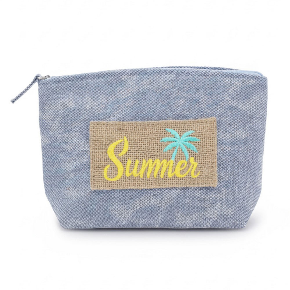 Details • Size : 9.5" X 6" X 2.5" • Zipper Closure • Material : 80% Polyester, 20% Burlap • Compact zipper pouch designed for daily organization, travel, and seasonal gifting. Ideal for holding cosmetics, accessories, or small essentials, this lightweight pouch offers easy storage and a clean silhouette that fits perfectly in totes, beach bags, and handbags for warm-weather use.