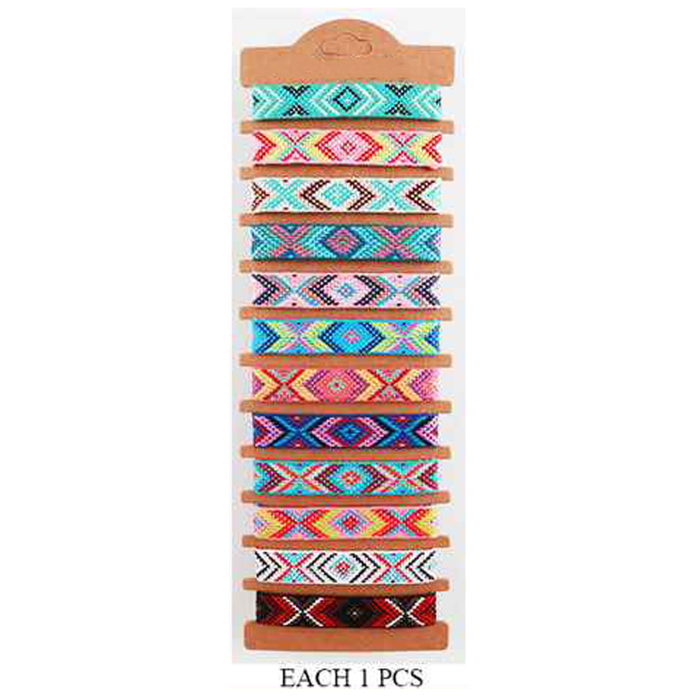 Details • Size : 0.6" H • Adjustable • Add a pop of color with this woven friendship bracelet set featuring bold boho-inspired patterns. Adjustable for a perfect fit, these bracelets are ideal for stacking, gifting, or everyday wear. A versatile accessory that brings a playful and vibrant touch to any casual outfit.