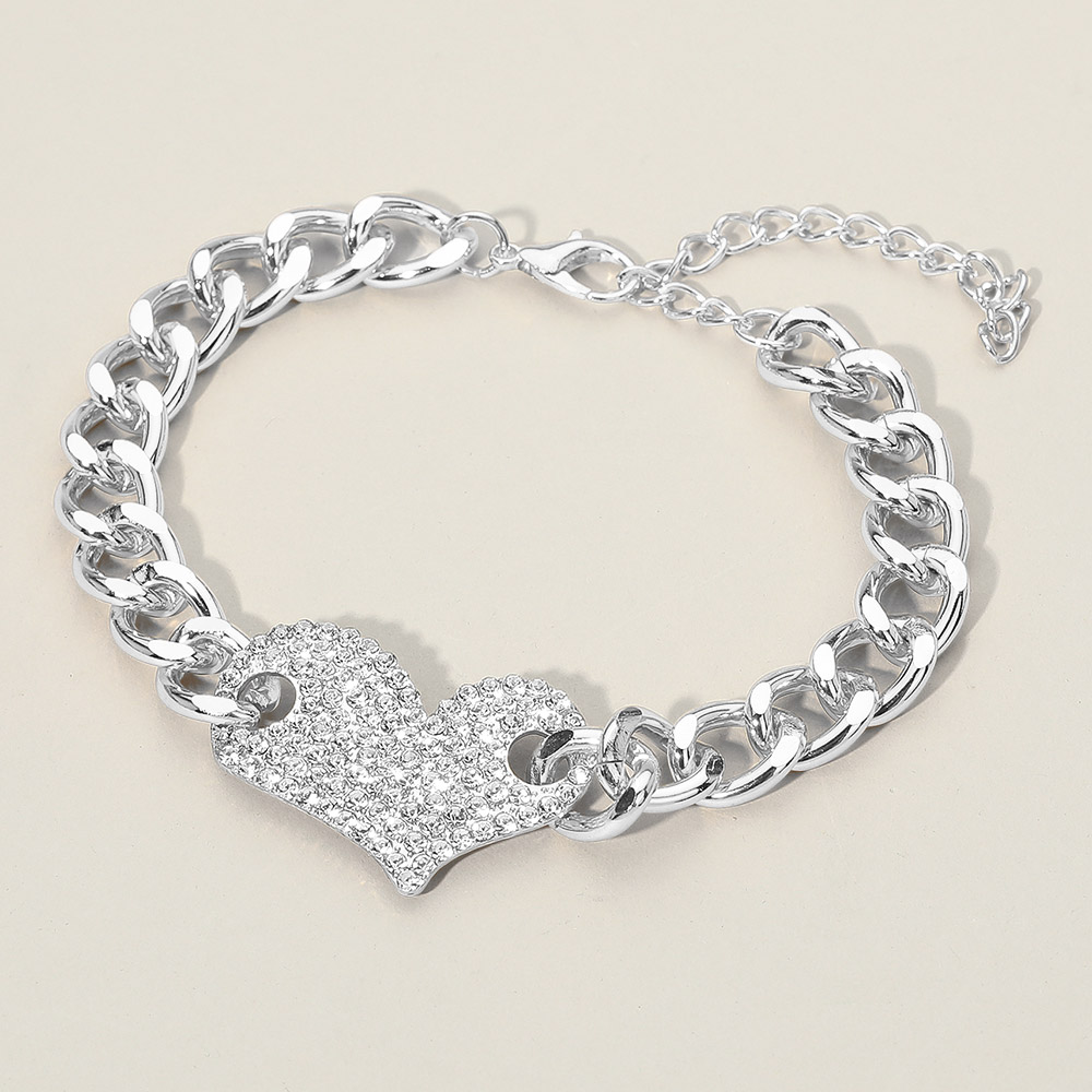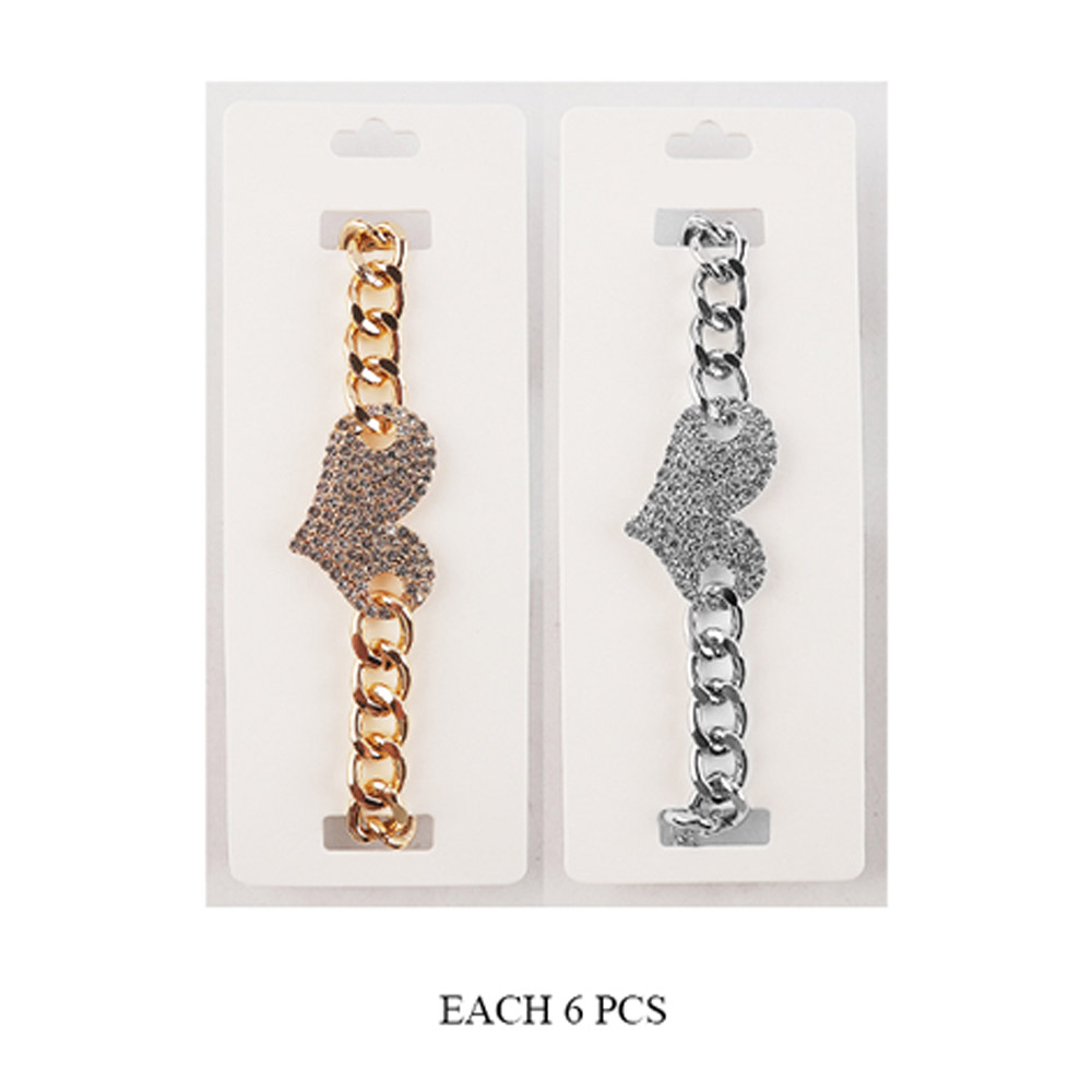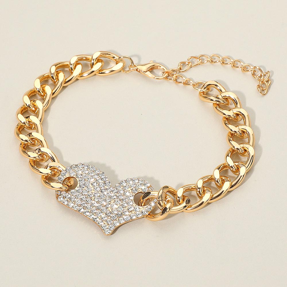 Details • Size : 1.2" H, 9.25" + 3" L • Lobster Clasp Closure • Show your style and sparkle with this Heart Charm Bracelet, featuring a bold chain design and a rhinestone-encrusted heart centerpiece. Perfect for adding a romantic and elegant touch to any outfit, this stunning accessory is ideal for gifting or personal wear. • Lead and Nickel Compliant