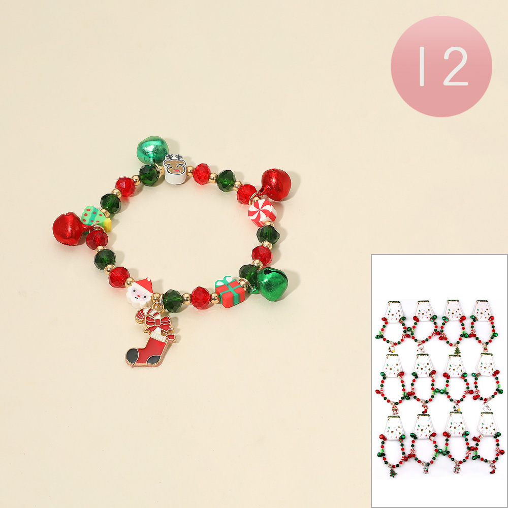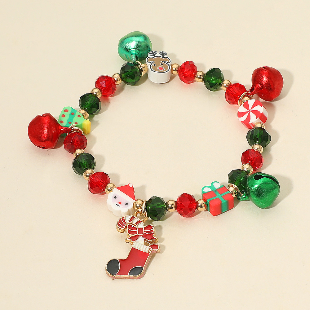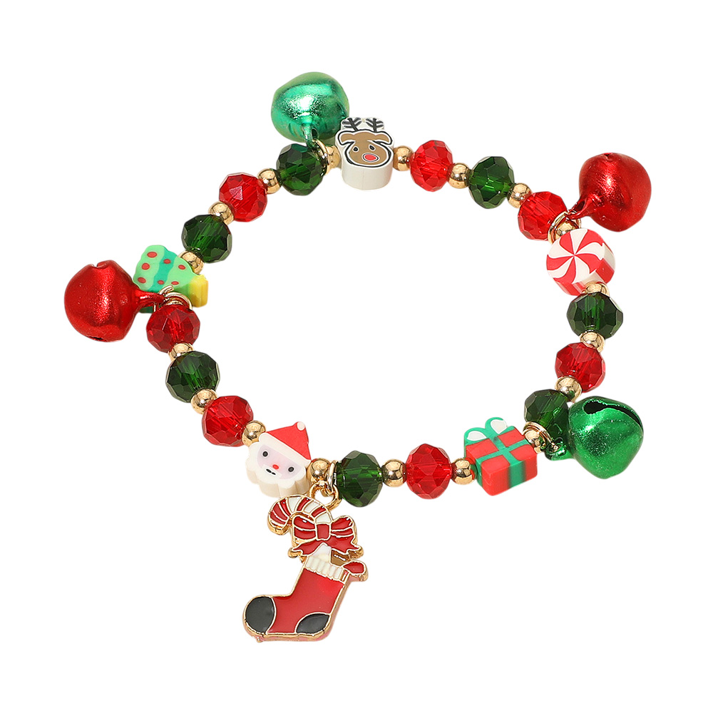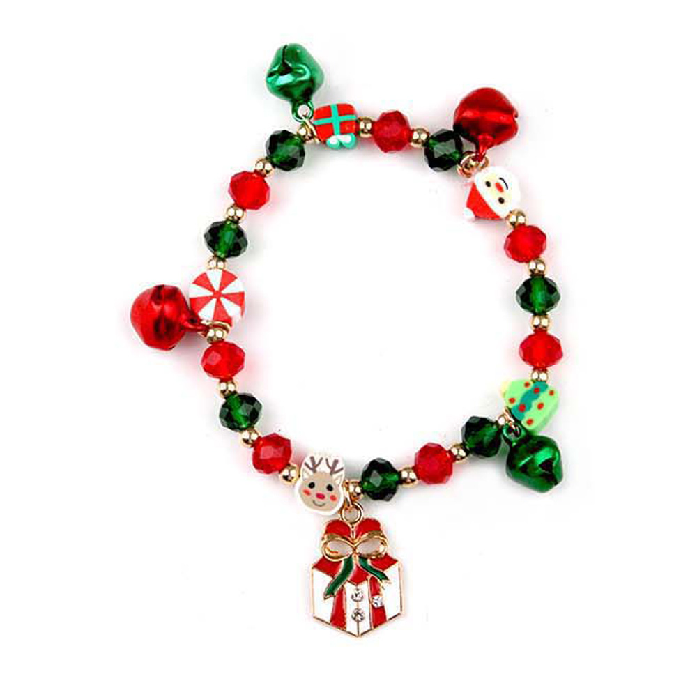 Details • Size : 0.4" H • Charm Size : 1.2" L • Stretchable • Add holiday cheer to your look with this Christmas stretch bracelet, featuring colorful beads, jingle bells, and playful festive charms including gifts, candy, stockings, and Santa accents. Easy to wear and perfect for parties, stocking stuffers, and seasonal celebrations.