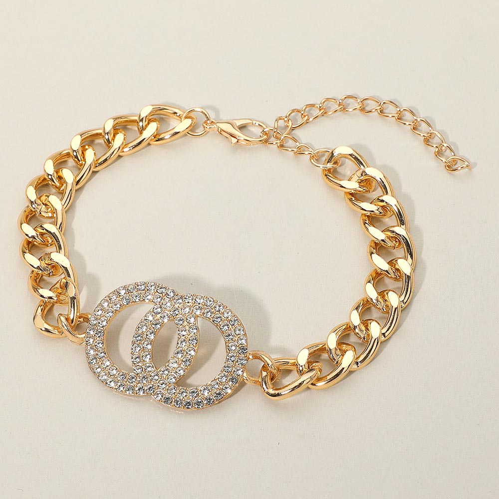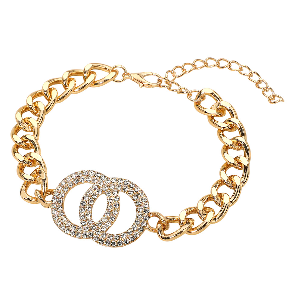 Details • Size : 1" H, 9.25" + 3" L • Lobster Clasp Closure • Enhance your elegance with this Double Circle Bracelet, featuring dazzling rhinestones and a sleek chain design. A timeless piece that symbolizes unity and sophistication, perfect for casual wear, evening outings, or as a thoughtful gift for someone special. • Lead and Nickel Compliant
