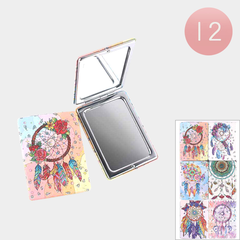 Details • Size : 2.4" X 3.4" • 2 In 1 - Plain Mirror And Magnifying Mirror • Portable folding compact mirror with dual-sided view and dreamcatcher pattern. Ideal for travel, purse, or daily touch-ups. Lightweight, stylish, and convenient for makeup checks anywhere.