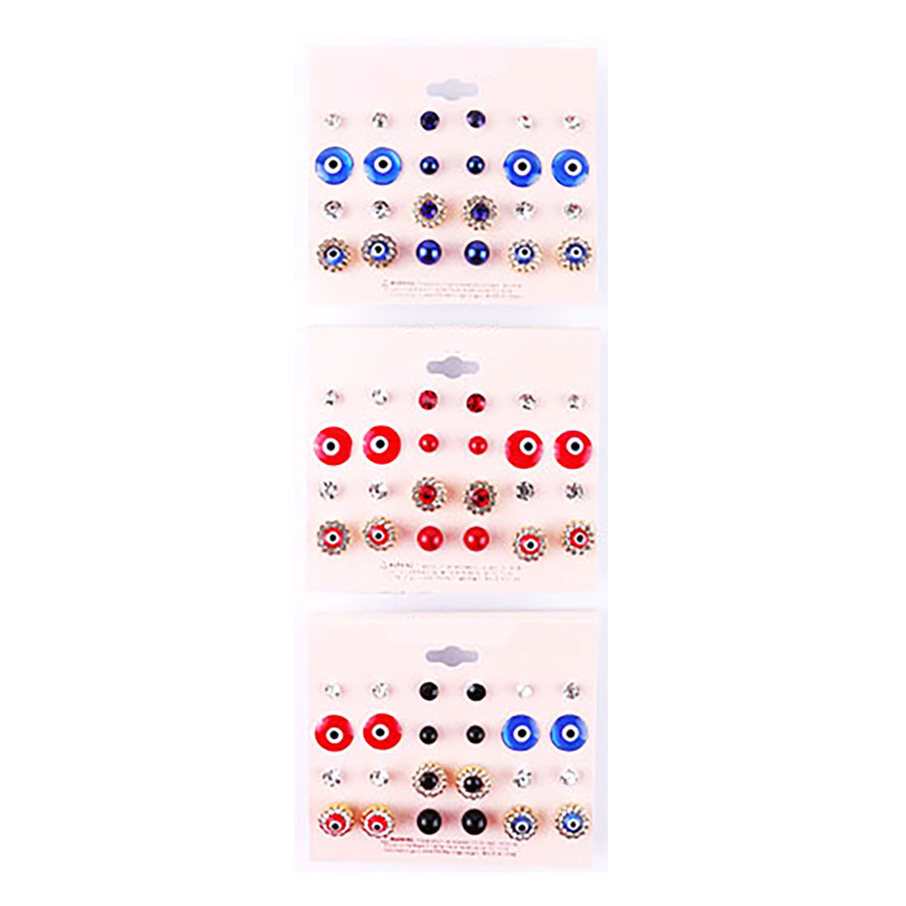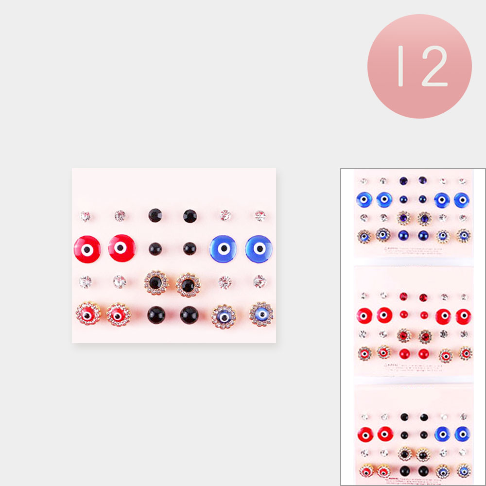 12 Set of 12 - Evil Eye Round Stone Bead Stud Earrings