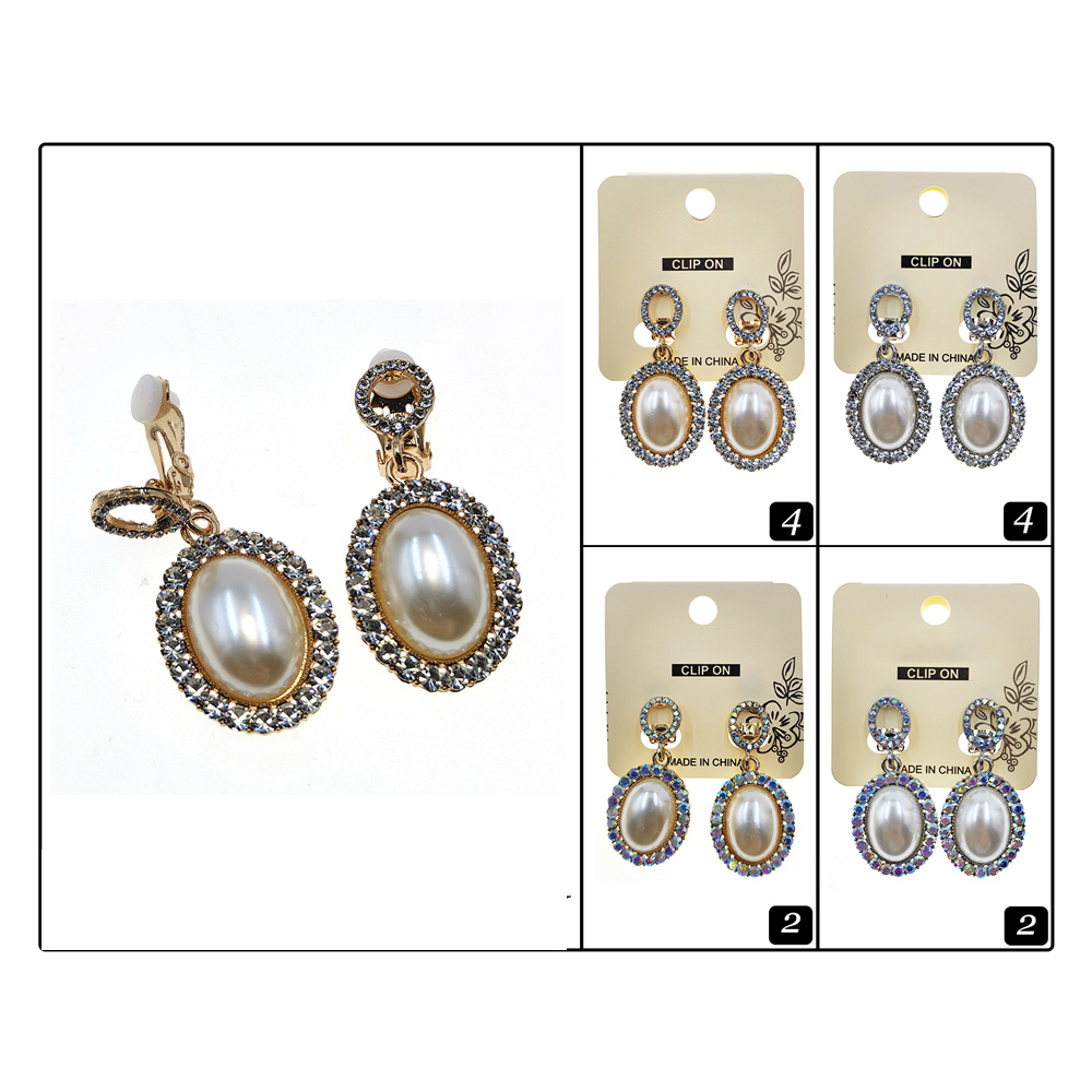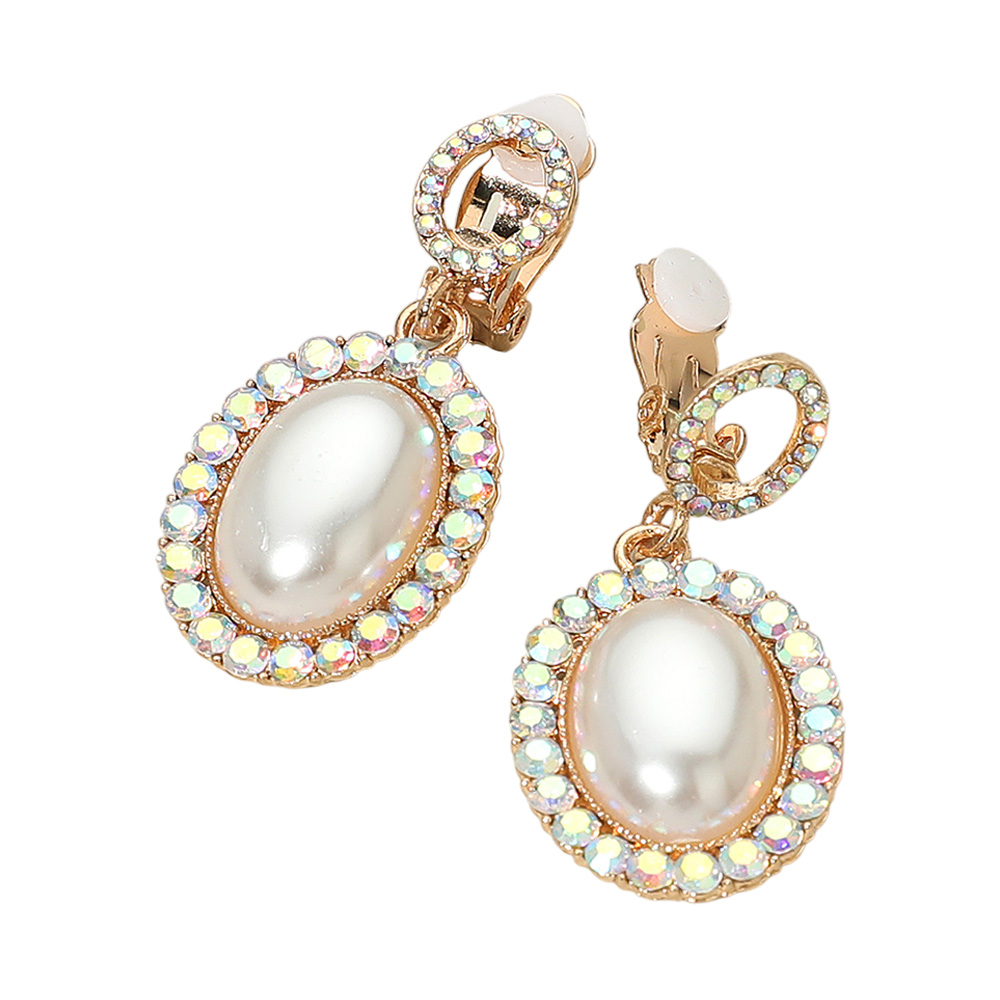 Details • Size : 0.75" X 1.75" • Clip On • Elevate your look with these oval pearl drop clip-on earrings, framed by a sparkling rhinestone halo. Designed for non-pierced ears, these timeless earrings blend classic elegance with modern shine, making them perfect for weddings, parties, and formal occasions.