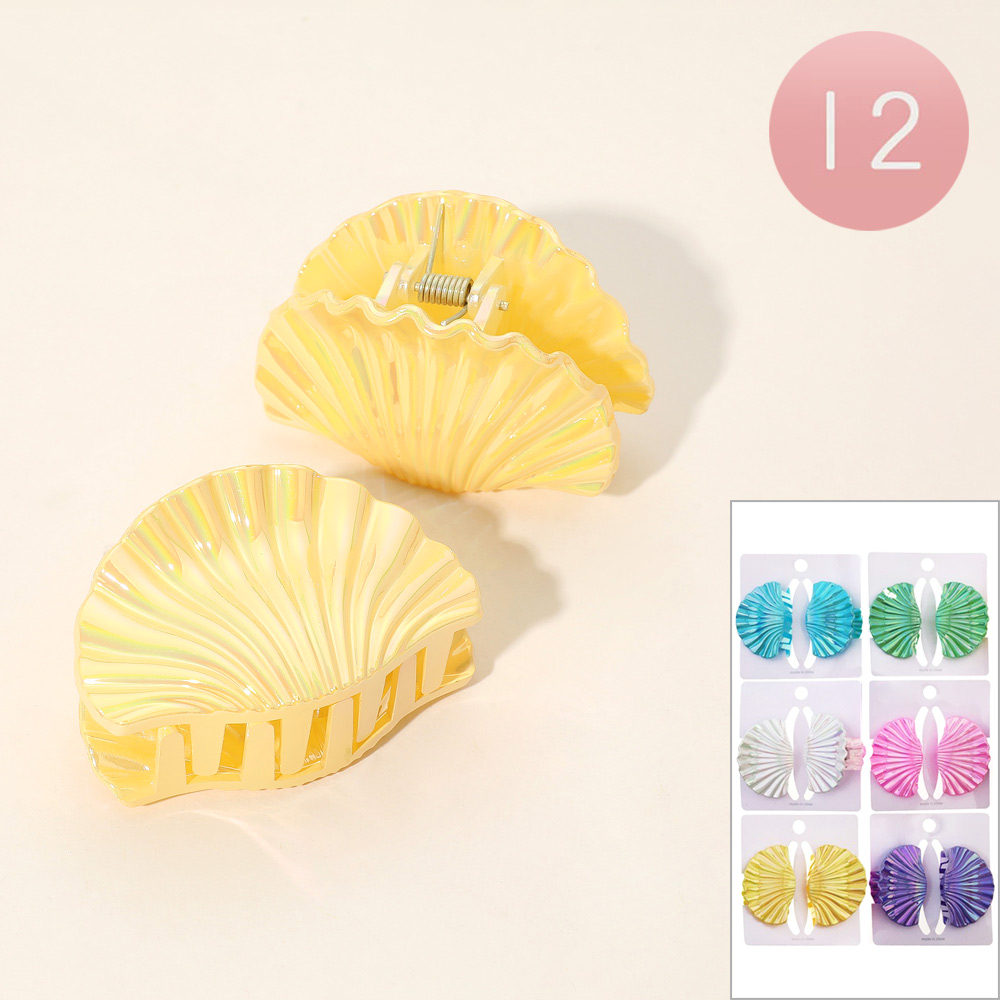 Details • Size : 2.3" X 1.6" • Durable hair claw clips designed in a shell shape for a secure and stylish hold. Ideal for casual or formal looks, these clips add a unique accent to any hairstyle. Set includes 12 assorted pieces.