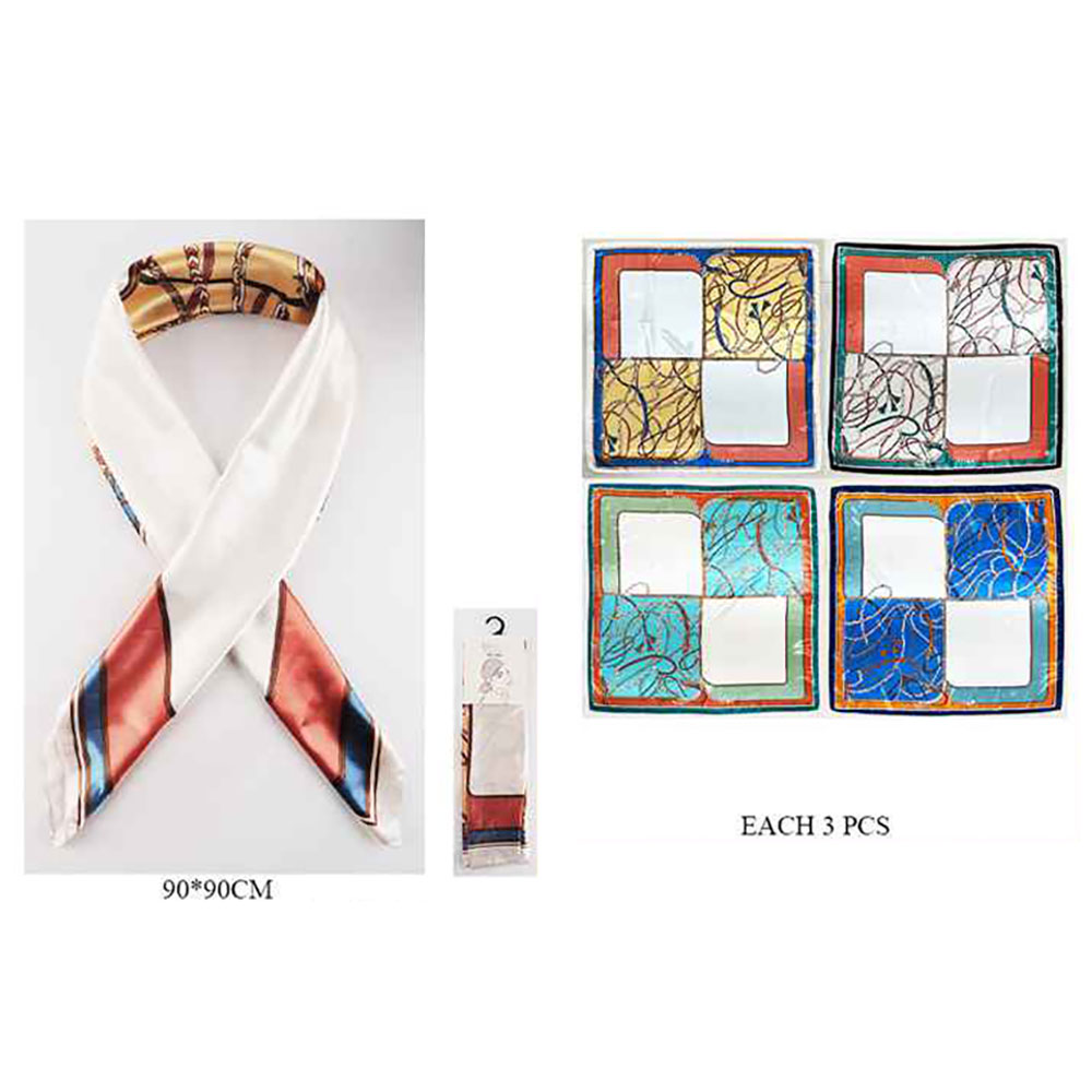 Details • Size : 36" X 36" • Material : 100% Polyester • A chic square scarf showcasing elegant motifs that add instant polish to any look. Ideal for neck styling, bag accents, or hair ties, it offers versatile wear and effortless sophistication for daily outfits or special occasions.