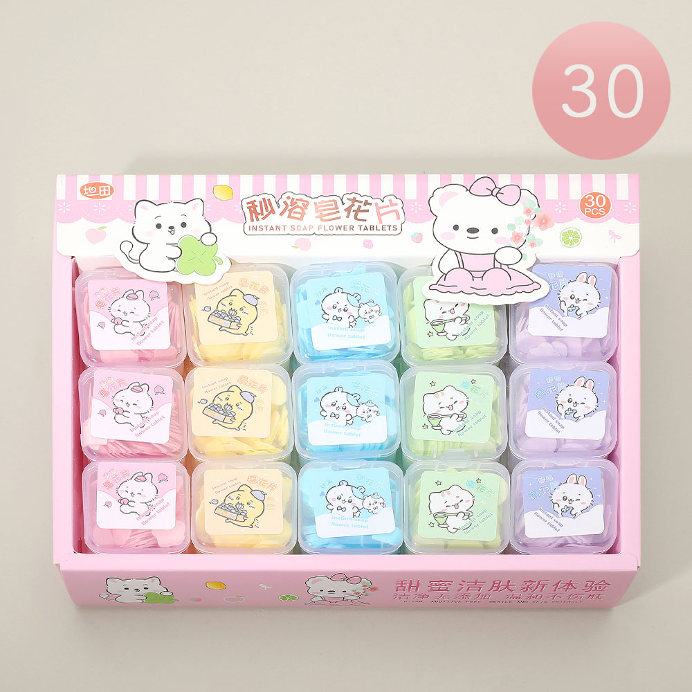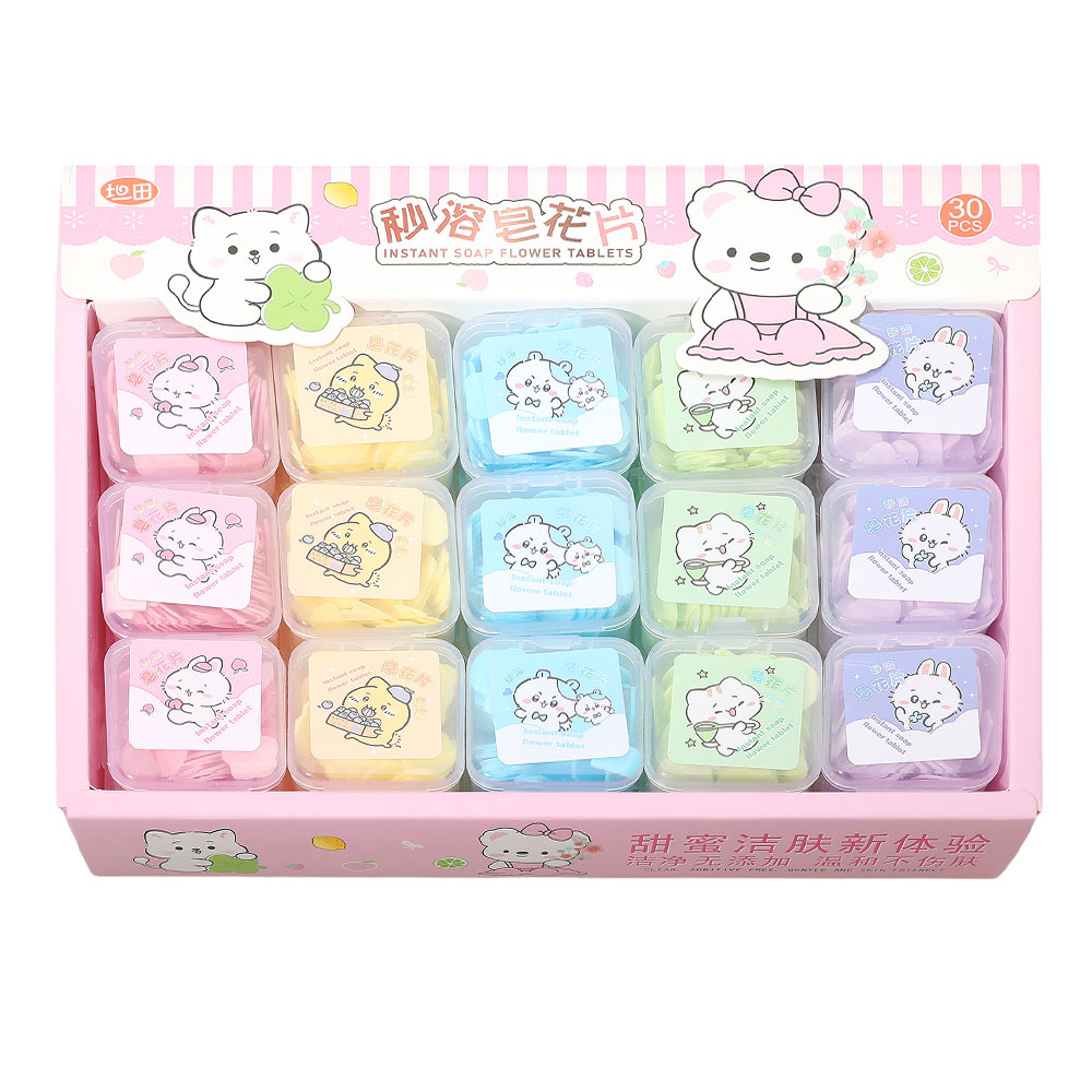 Details • Siez : 1.75" X 1.75" X 0.75" • Set of 30 instant soap flower tablets in adorable animal cases. Each box features single-use soap petals for easy handwashing at home or on the go. Perfect for travel, gifts, or kids’ hygiene kits—compact, convenient, and delightfully designed for everyday freshness.
