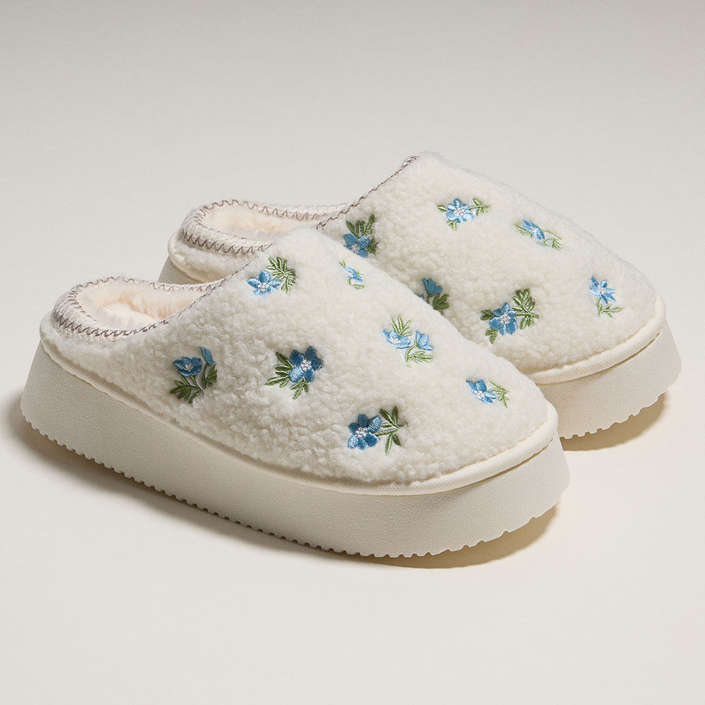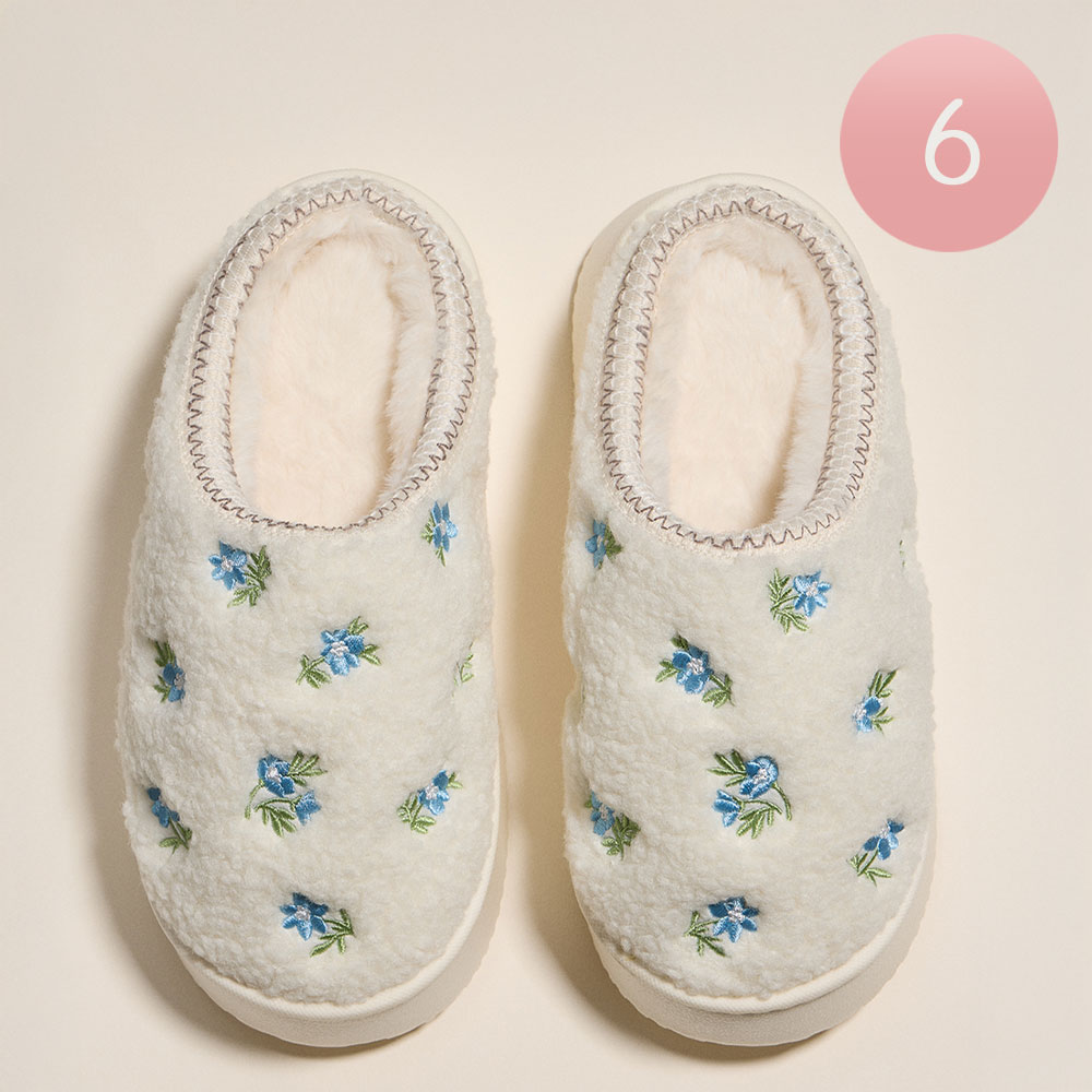 Details • Size : 6 Pairs Assorted size in each pack • 2 Small, 3 Medium, 1 Large • S: women size 6-7 (260 mm) 38-39 • M: women size 8-9 (270mm) 40-41 • L: women size 10-11 (280mm) 42-43 • Material: 50% PVC, 50% Polyester • Sherpa, Rubber Sole • Step into comfort with these sherpa-lined slippers featuring delicate floral embroidery. Perfect for lounging at home, they offer plush warmth and a charming cottagecore vibe all season long.
