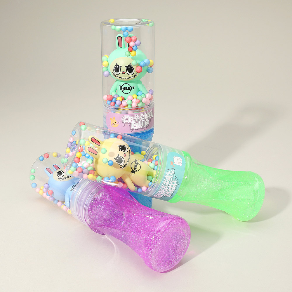 Details • Size : 7.5" L • Crystal mud slime toy set featuring cute bunny character containers filled with glitter slime and foam beads. Stretchy, soft, and fun to squish, perfect for sensory play, party favors, or stress relief. A playful and colorful way for kids to enjoy creative hands-on entertainment.