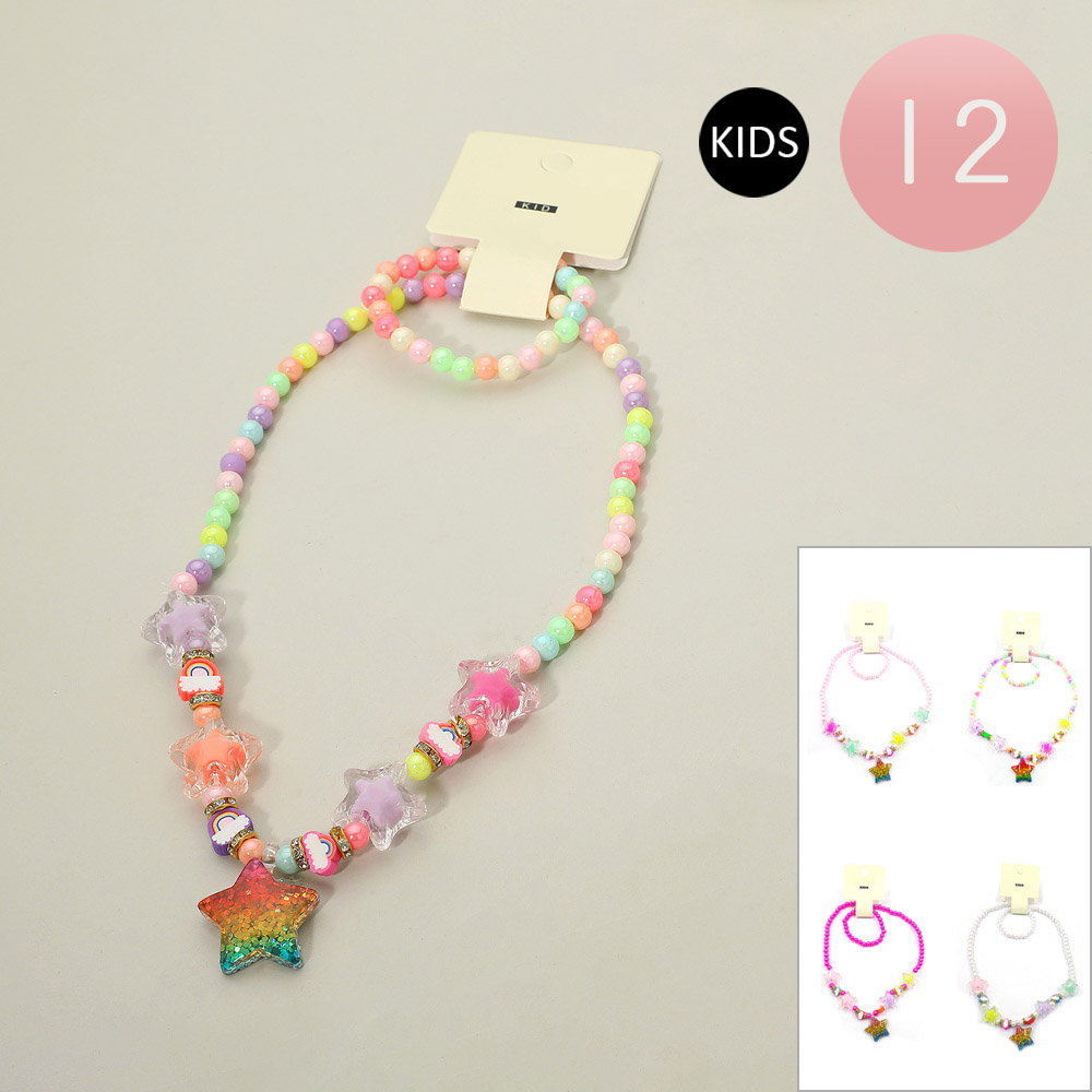 Details • Necklace Size : 15" L / Stretchable • Pendant Size : 1.25" L • Bracelet Size : 0.25" H / Stretchable • Charming kids’ jewelry set featuring a glittery star charm on a beaded necklace with matching bracelet. Great for party favors, birthdays, or dress-up play, this 12-piece pack adds fun sparkle and playful style, making it a delightful accessory choice for imaginative children.