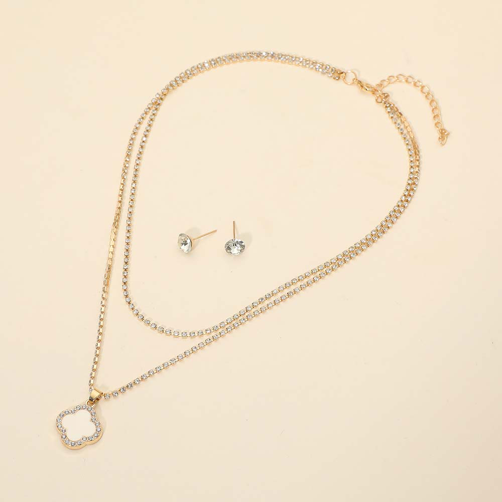 Details • Necklace Size : 16.5" + 2.5" L • Decor Size : 2.5" L • Pendant Size : 0.7" X 1" • Earrings Size : 0.3" L • Complete your look with this quatrefoil pendant tennis necklace and stud earring set featuring a continuous sparkling chain and a delicate quatrefoil-shaped charm centerpiece. Designed for coordinated wear or styling separately, it adds refined elegance to everyday outfits and special occasions, making it a versatile, gift-ready accessory set.