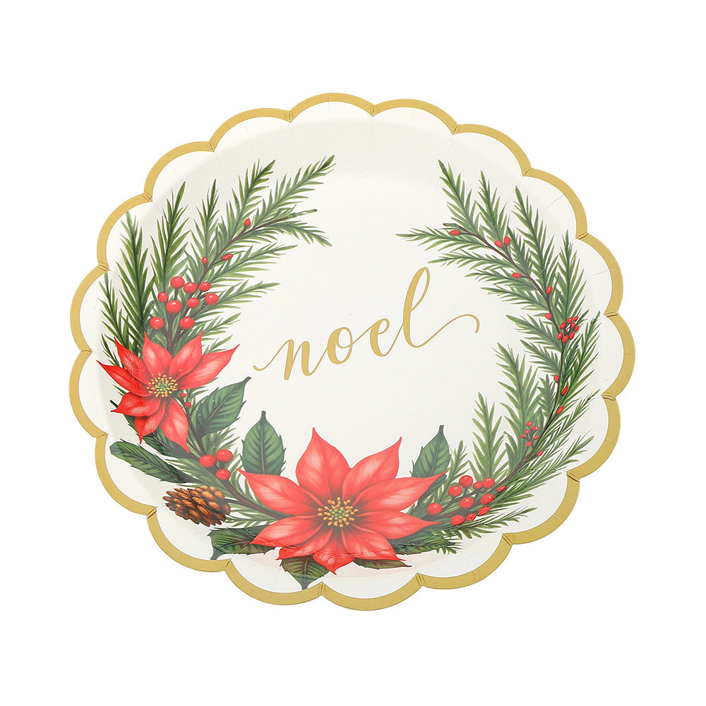 Details • Size : 10" X 10" • Serve your holiday treats in style with these Noel paper plates featuring a festive wreath and poinsettia design. With scalloped edges and elegant details, perfect for Christmas parties, gatherings, and seasonal entertaining.