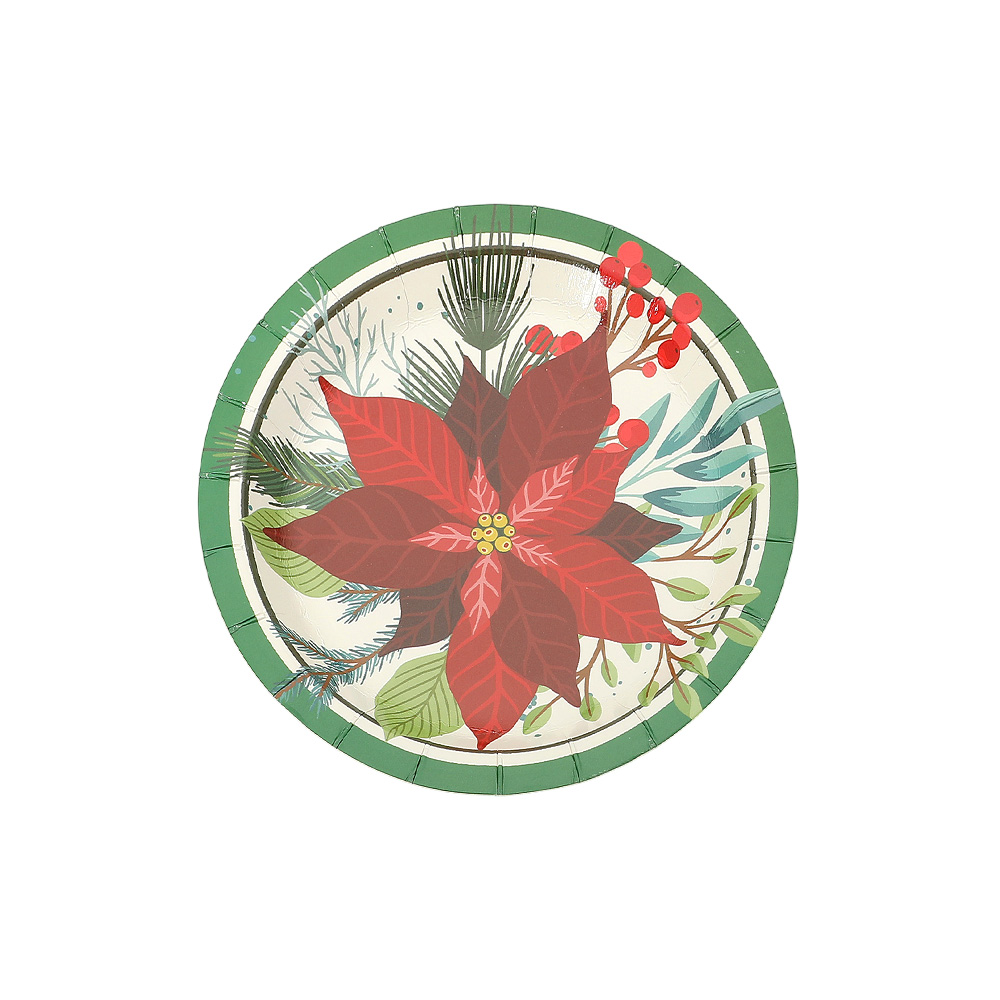 Details • Size : 7" X 7" • Serve holiday meals in festive style with these poinsettia paper plates featuring a vibrant floral design and green border. Perfect for Christmas dinners, parties, and seasonal gatherings, this 16-pack combines convenience with cheerful holiday elegance.