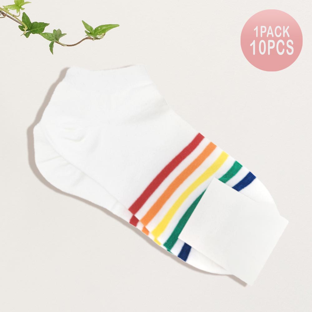Details • Size : 9 - 11 • Material : Cotton, Spandex, Polyester, Polyurethane • Vibrant rainbow stripe ankle socks in a 10-pack offering soft, stretchy comfort for everyday wear. Designed for a cheerful, casual style, these lightweight socks add a playful pop to any outfit while keeping your feet cozy and breathable all day long—perfect for gifting or daily use. • Made In Korea