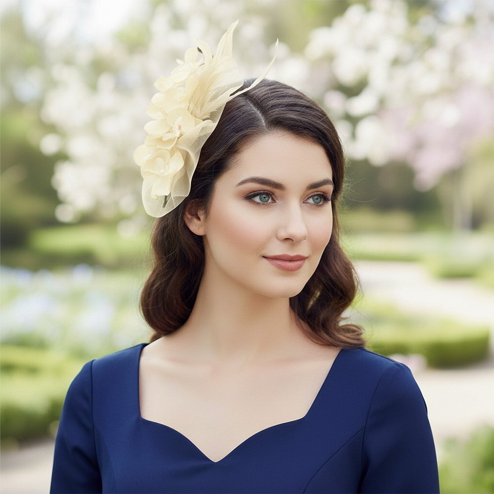 • Elegant fascinator headpiece featuring floral detailing and feather accents, perfect for weddings, garden parties, or race day events. Designed to sit gracefully, this accessory adds a refined touch to dressy outfits with elegance and charm.