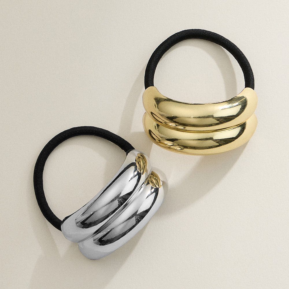 Details • Size : 2" X 1" • Stretchable • Elevate your everyday hairstyle with this double band metallic hair band featuring a sleek polished design. Both practical and fashionable, it keeps ponytails secure while adding a modern touch of shine, making it the perfect accessory for casual and elegant looks alike. • Lead and Nickel Compliant