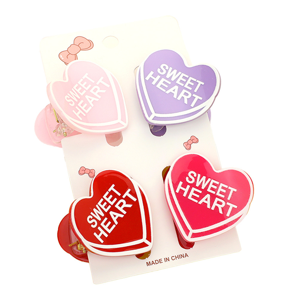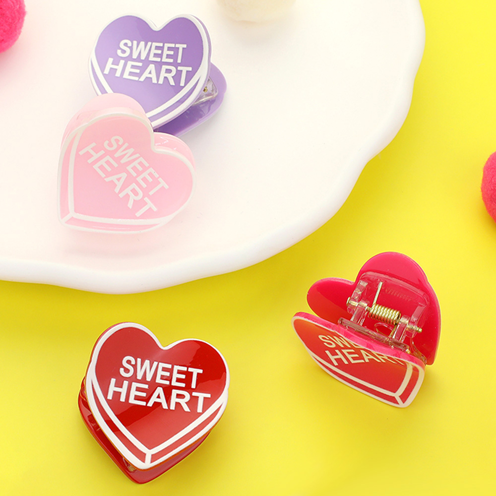 Details • Size : 1.5" X 1.6" • Playful heart-shaped hair claw clips featuring a bold “Sweetheart” message, designed to add a fun and charming touch to everyday hairstyles. Easy to use and secure, they are ideal for holding bangs or half-up styles and work well for gifting, seasonal promotions, and trend-focused accessory displays.