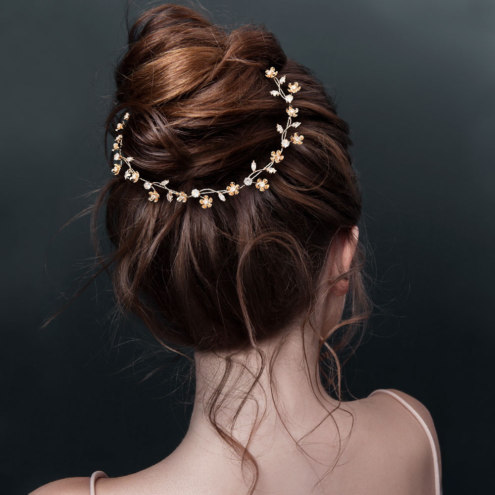 Details • Size : 11" X 0.8" • A Pair Bobbi Pin Included • This bridal hair vine showcases petite blossoms and sparkling cz crystal details arranged along a flowing, organic design. Flexible for shaping around updos or half-up styles, it brings a soft, romantic elegance ideal for weddings and formal occasions. • CZ Cubic Zirconia • Lead and Nickel Compliant